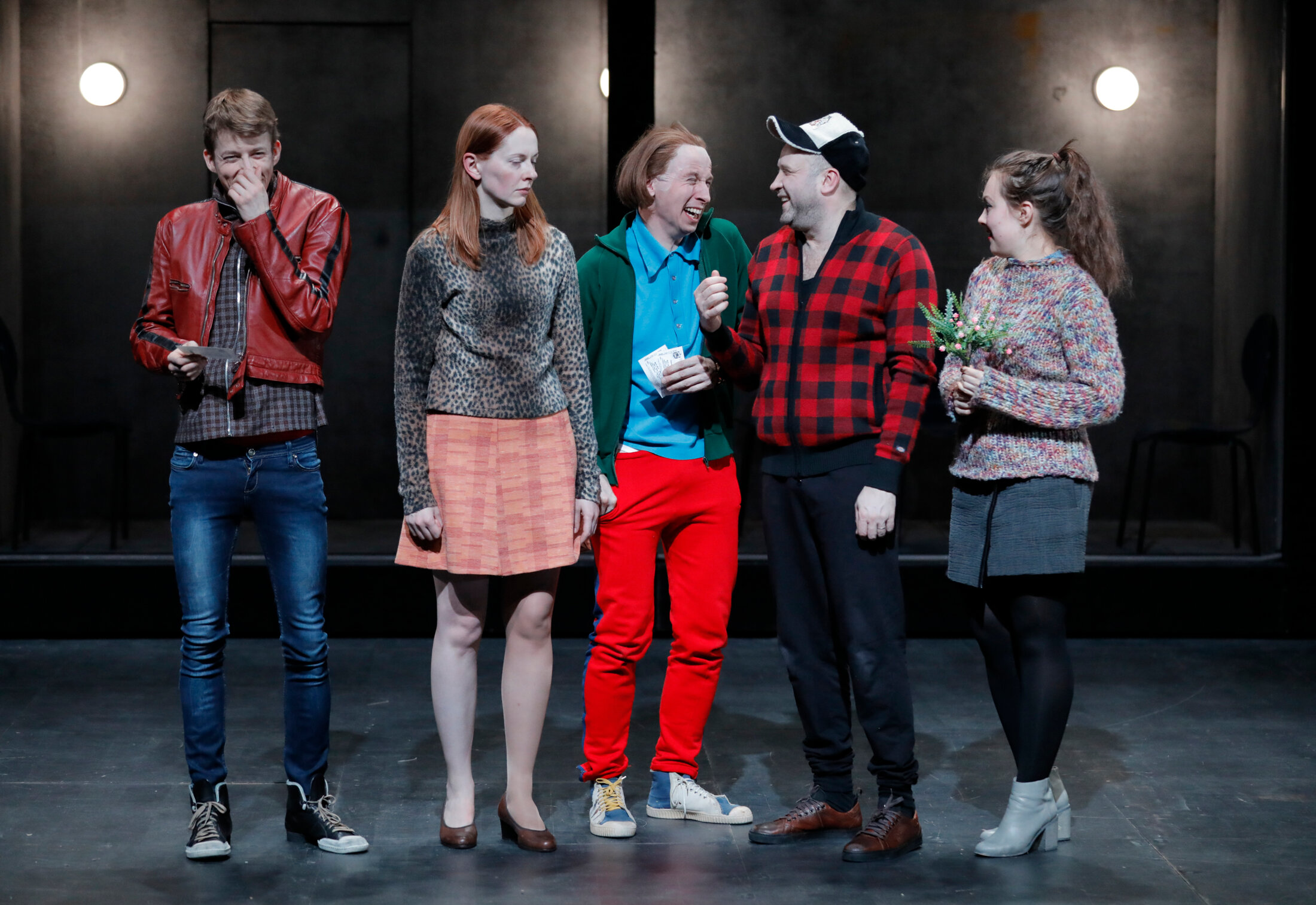 Cette étroitesse est une source de bien des jeux de scène où les acteurs de la troupe russe se régalent et nous régalent. Ce ne sont pas des espaces réalistes : une porte, et accessoirement une chaise ou un lit, le minimum ; c’est avant tout un espace de jeu. Bellorini suit en cela les indications de Levin. Cet auteur qui excelle dans la comédie (dans d’autres pièces, il s’adonne à la satire politique ou à la réécriture de la mythologie) ne décrit aucun mobilier comme aimaient à le faire nos maîtres du vaudeville. Tout est dans le verbe, tout est dans les corps.