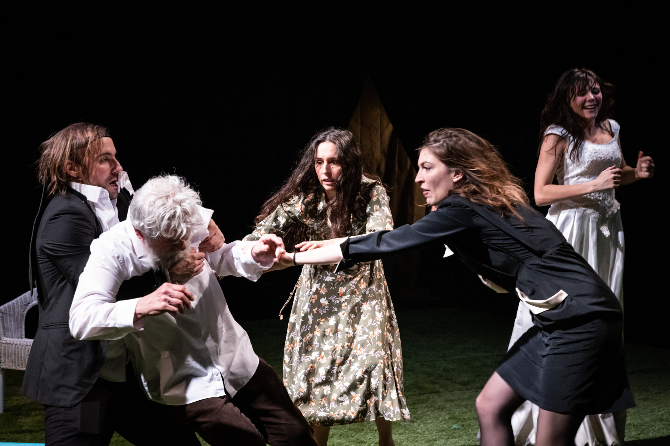 Lorsqu’elle a créé et joué (avec d’autres) sa précédente pièce Le massacre du printemps (lire ici), Elsa Granat était enceinte. Elle évoquait ses parents qu’elle venait de perdre l’un et l’autre d’un cancer. Eux sont partis sans connaître l’enfant qui allait naître et Elsa Granat ne verrait pas, elle, vieillir ses parents. Il y avait là comme un manque et une perte que viennent aujourd’hui compenser et renverser en simulacre, une fiction, celle de sa nouvelle pièce King Lear syndrome ou les mal élevés. On y retrouve Antony Cochin, Clara Guipont, Edith Proust et Hélène Rencurel qui étaient déjà dans la distribution du précédent spectacle. C’est la première fois que la metteuse en scène, autrice et actrice Elsa Granat travaille à partir d’un texte classique, Le roi Lear de Shakespeare, mais c’est pour mieux le détourner. « C’est un jardin dans lequel je vais biner » dit-elle.