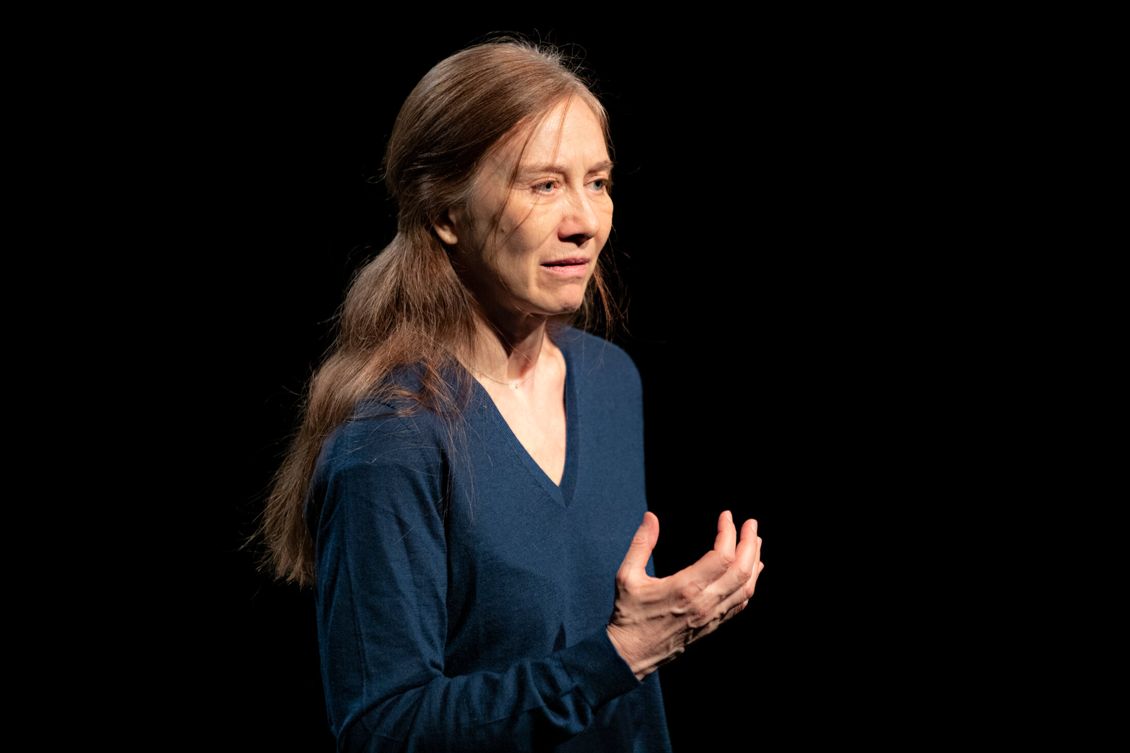 L’actrice Valérie Dréville entre par le fond et s’avance sur le plateau nu. Pas de décor, pas d’effet de lumière. Elle gagne le centre de la scène, vient un peu vers les spectateurs, s’arrête. Ses deux pieds chaussés de discrets escarpins noirs sont quasi réunis, le pied droit légèrement en biais. Elle ne bougera plus avant longtemps. Elle porte un pantalon sombre, un léger pull bleu en V dégageant son cou. On ne voit d’elle que son visage et ses mains. Elle nous regarde et dit les premiers mots du texte Un sentiment de vie écrit par Claudine Galea :