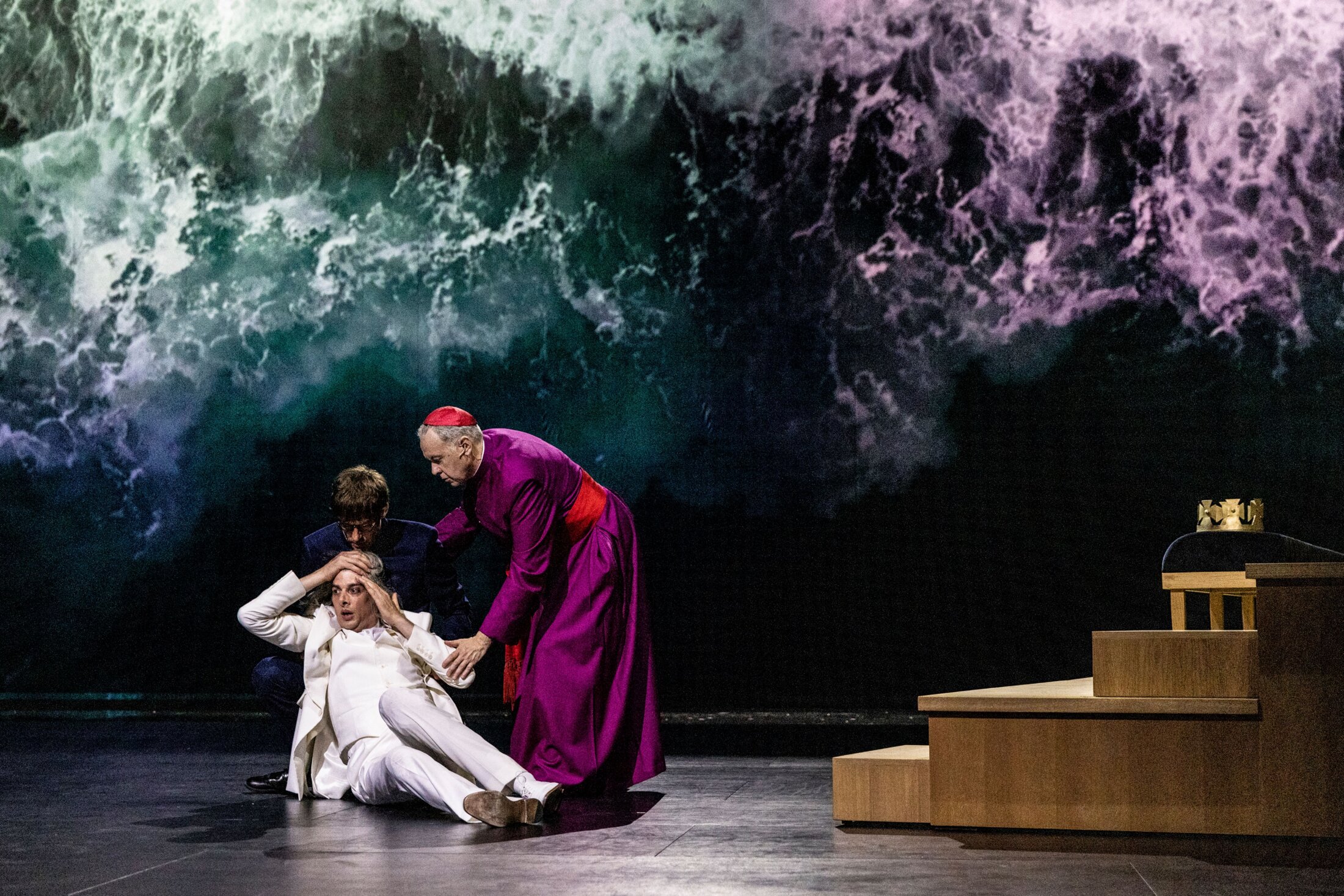 Les tragédies historiques de Shakespeare ont besoin d’air, de lignes de fuite, de bordures, d’espaces perdus, de marches montant vers un trône et de machines à jouer. Tout y est dans cette scénographie ouverte et mouvante appuyée sur deux vastes gradins de marches, escaliers fantômes menant au sommet et donc au bord de la chute. Les noms de lieux (une multitude) où se passent les scènes de la pièce sont projetés sur un écran, cela suffit à notre contentement et cela concentre l’attention sur les relations humaines les jeu de pouvoir, d’alliances et de trahisons qui traversent la pièce. Le pugilat autour du trône avec son panier garni de traîtrises et de complots peut commencer.