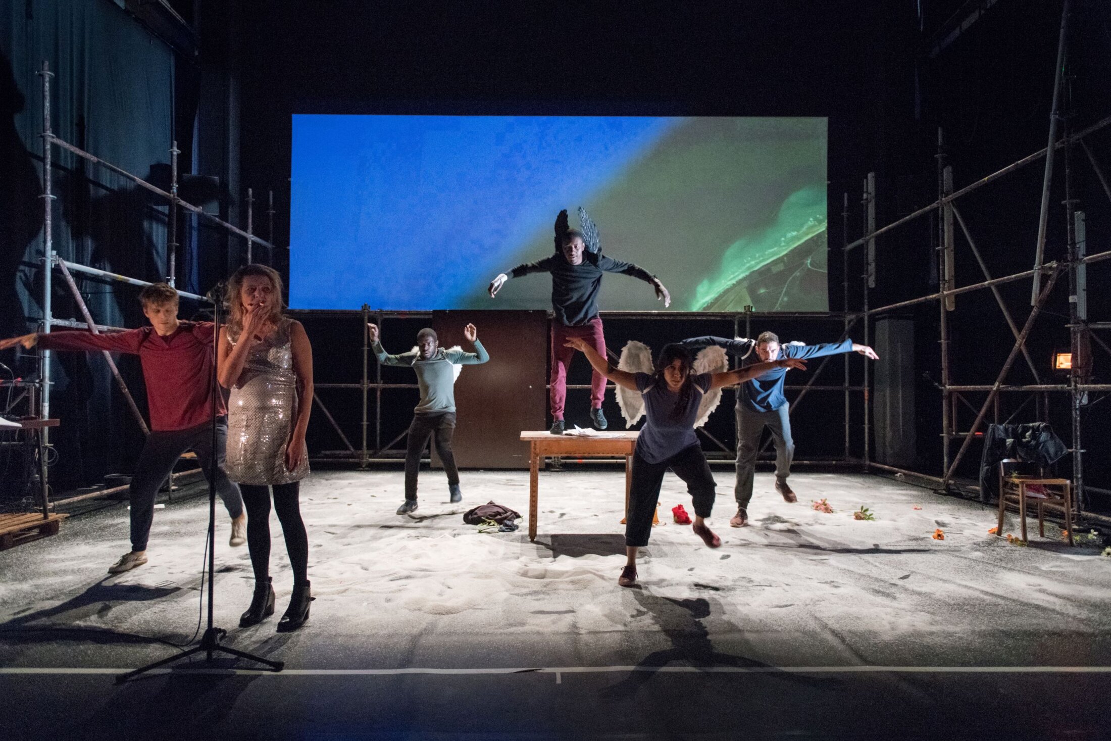 Une litanie de noms s’affiche sur l’écran au fond du plateau quand n’y coule pas une mer noircie par le deuil, quand des chemins d’exil n’y serpentent pas à travers des montagnes ocres ou des déserts aveuglés de lumière. Rythmant la parole de Nadège Prugnard, l’encadrant, la prolongeant, Blanca Franco et Sébastien Davis Vangelder se dressent l’un sur l’autre pour tutoyer les étoiles, Hervé Hassida se roule par terre de solitude, Mourad Bouhlali, as de la percussion corporelle, entraîne tout le monde tandis que Forban N’Zakimuena improvise en direct. Cirque, danse, musique, mots proférés, frontières abolies, avancent de front.