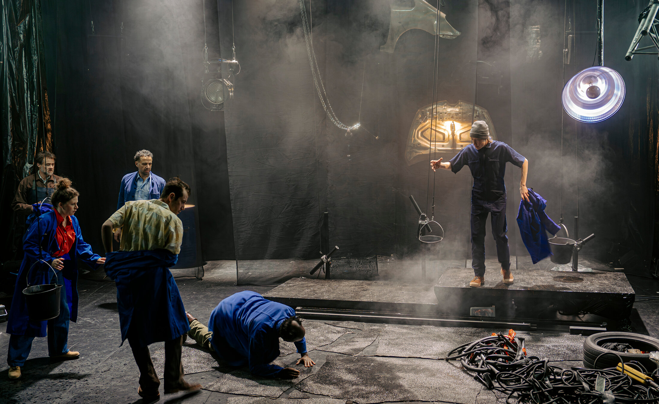 Tout se joue dans un espace unique fait de ferrailles, de pneus, de poulies (Clara Hubert et Ninon Le Chevalier signent la scénographie et les costumes) complété par l’excellent travail vidéo de Jean Doroszczuk. En scène, cinq actrices et acteurs : Emilien Audibert, Katell Jan, Adil Laboudi, Julie Moulier, Assane Timbo et Olivier Werner. Bel espace métaphorique, jeu fluide.Ce qui manque, c’est une introspection plus intense des personnages, une narration affirmant plus finement les rapports de force.