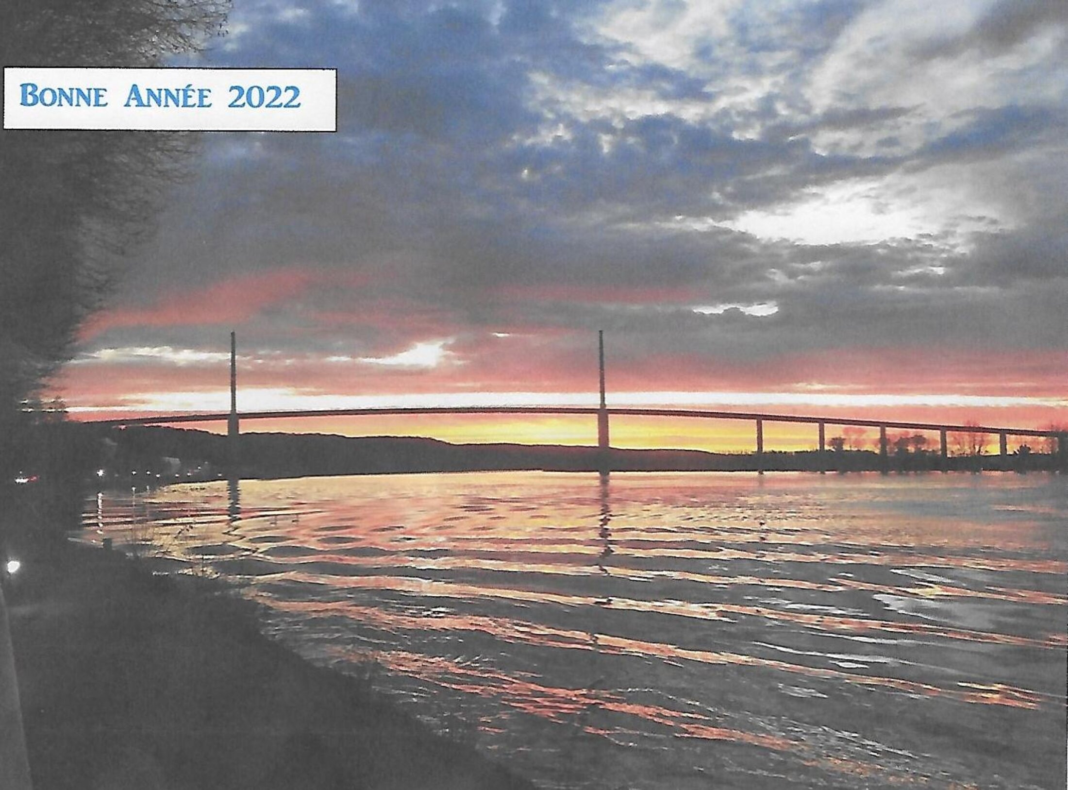 Ce matin, vers huit heures trente, ce lever de soleil derrière le pont de Brotonne, jetait l’espoir sur la Seine devant mon jardin et mon atelier artistique que le public ne fréquente plus depuis le début de l’année 2020. Cette image que je vais certainement peindre m’envoie un soleil "antiviral" (virus contre la santé ou virus politique aux nombreux variants)  que j’espère partager avec vous, vite, très vite en ce début d’année 2022.