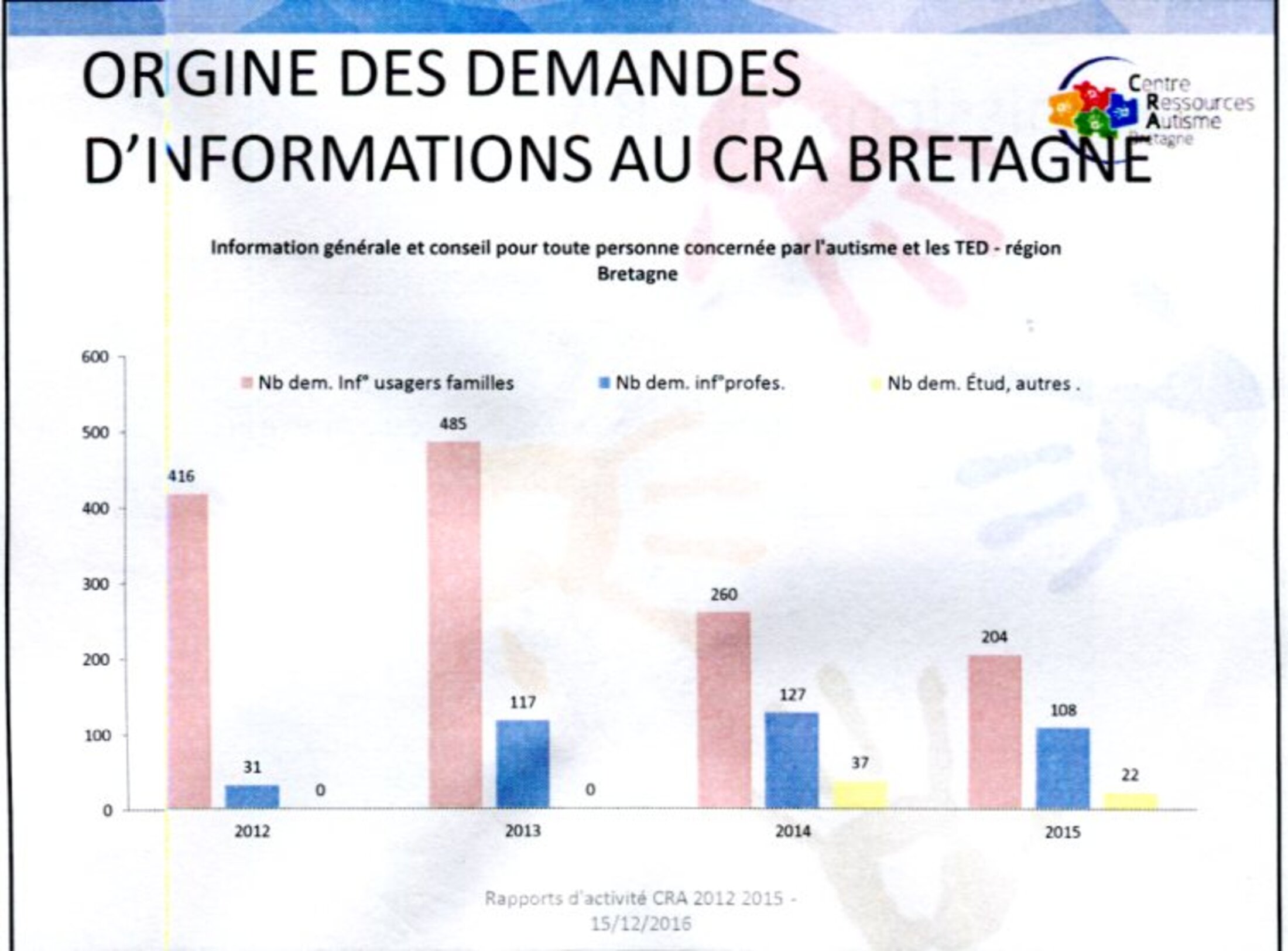 Conformément à ce qui avait été demandé par l'union régionale Autisme France de Bretagne, le nouveau CRA a présenté l'activité de l'ancien CRA depuis 2012. La dernière présentation avait été faite par le Pr Botbol en décembre 2013.