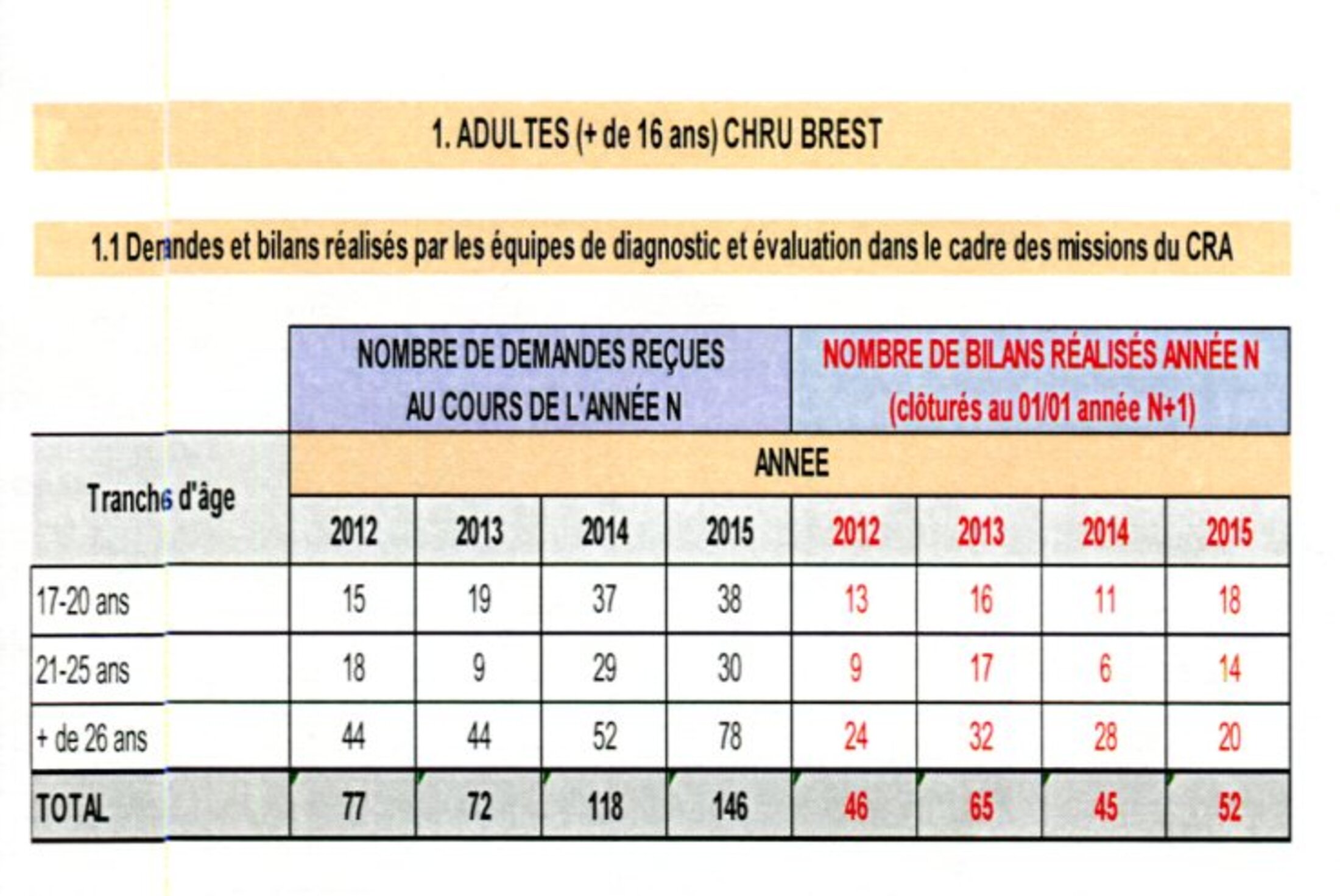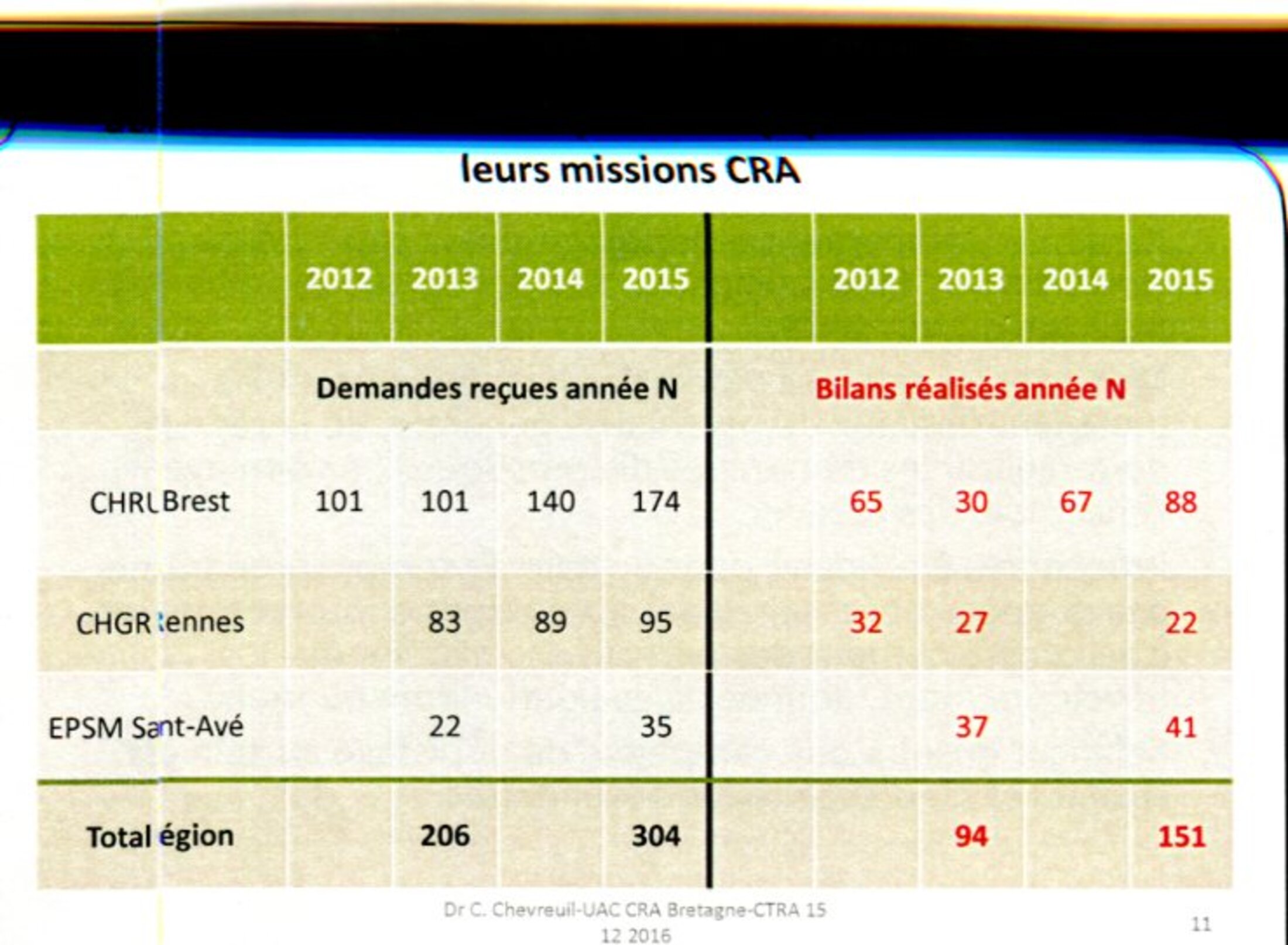 Aujourd'hui, grâce aux données CNSA, figurant dans le rapport de l'IGAS et dans un document de l'ARS de fin 2014, - données 2012/2013/2014 - on s'aperçoit que les données étaient complètement bidonnées. Les diagnostics du CRA ont été divisés par 2 à Brest – en partie masqués par la montée des équipes associées de Rennes et de Vannes (Saint Avé)."