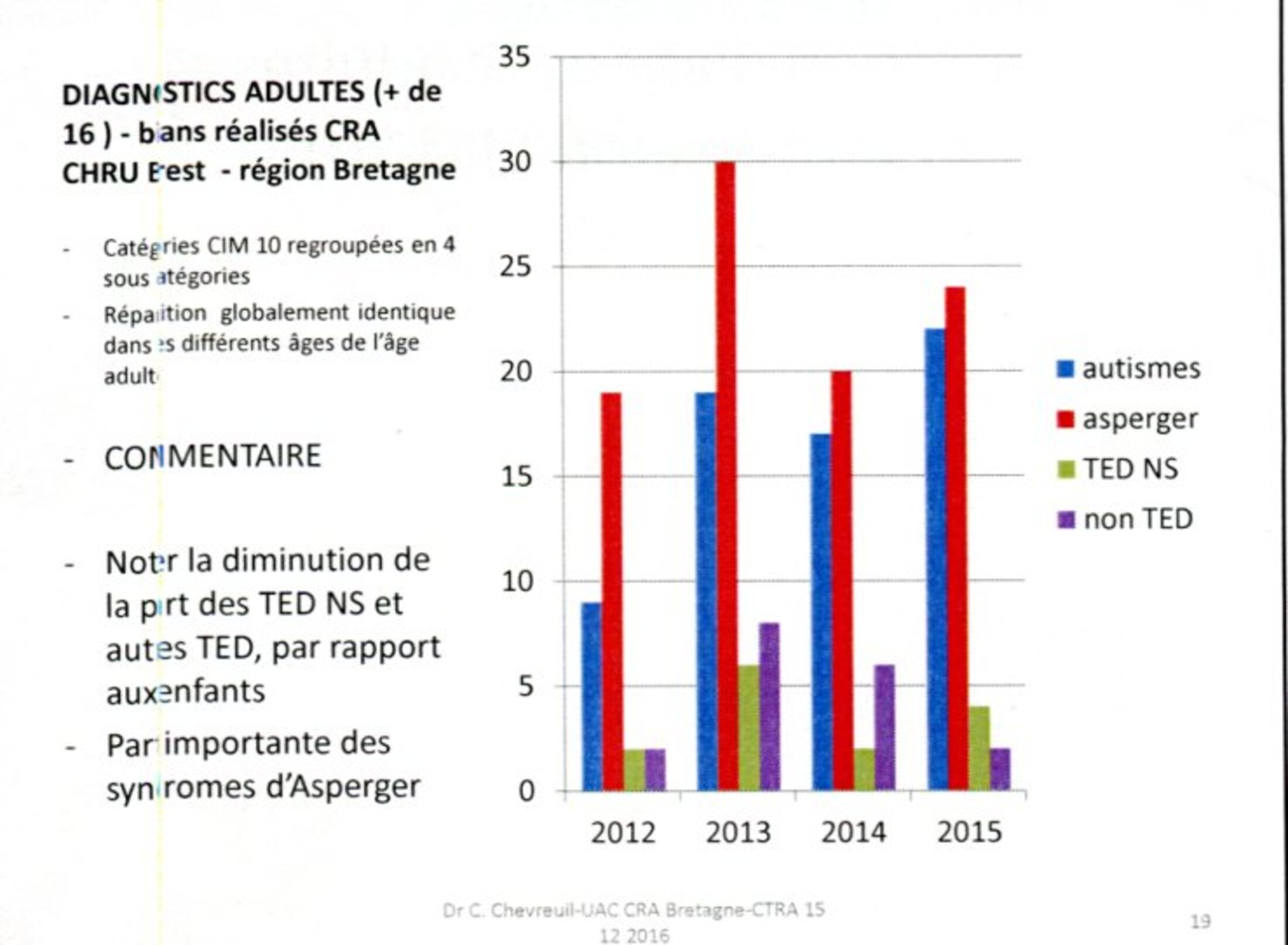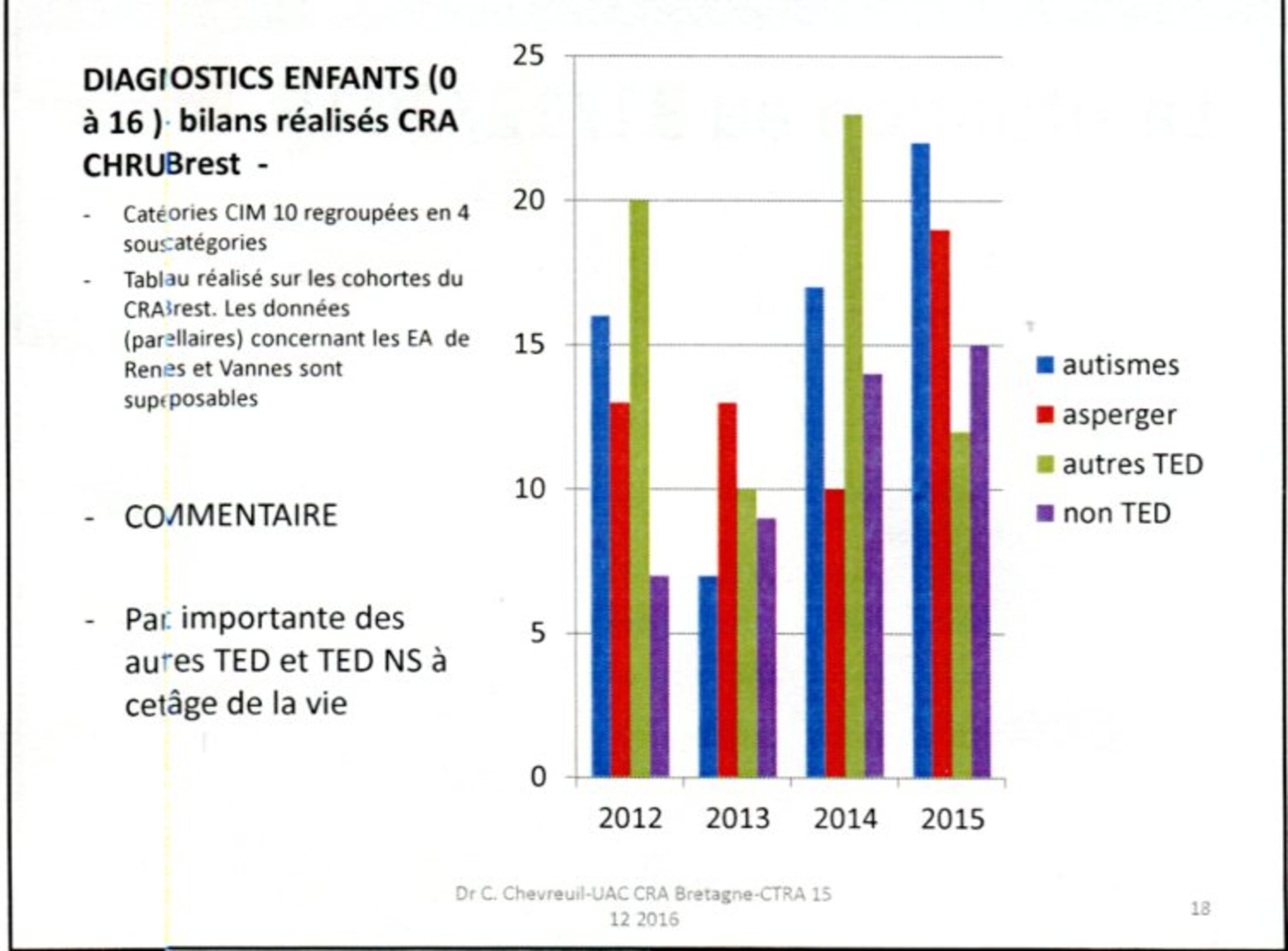 Les bilans des diagnostics enfants réalisés à Brest montrent une augmentation du nombre des diagnostics « non TED ». Cela est conforme aux informations que nous recevions et à la volonté politique exprimée par Botbol, chef de service : dégonfler la bulle, transformer les Asperger en schizophrènes ou en « troubles de la personnalité»...