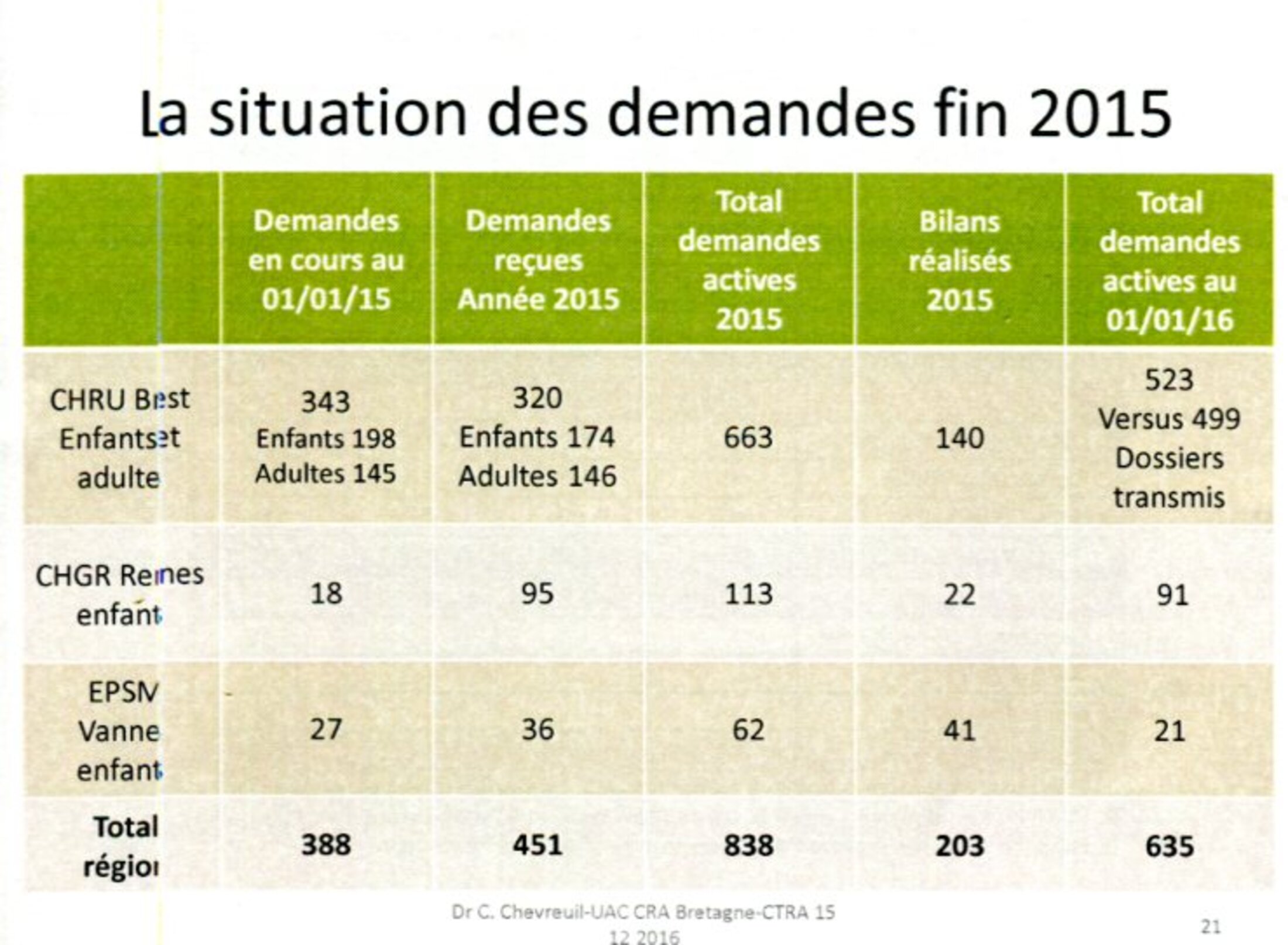 Au 1er janvier 2016, il y avait 635 demandes en cours, soit 3 années de diagnostic. Les délais d'attente étaient de 540 jours à Brest en 2015, 523 à Rennes.