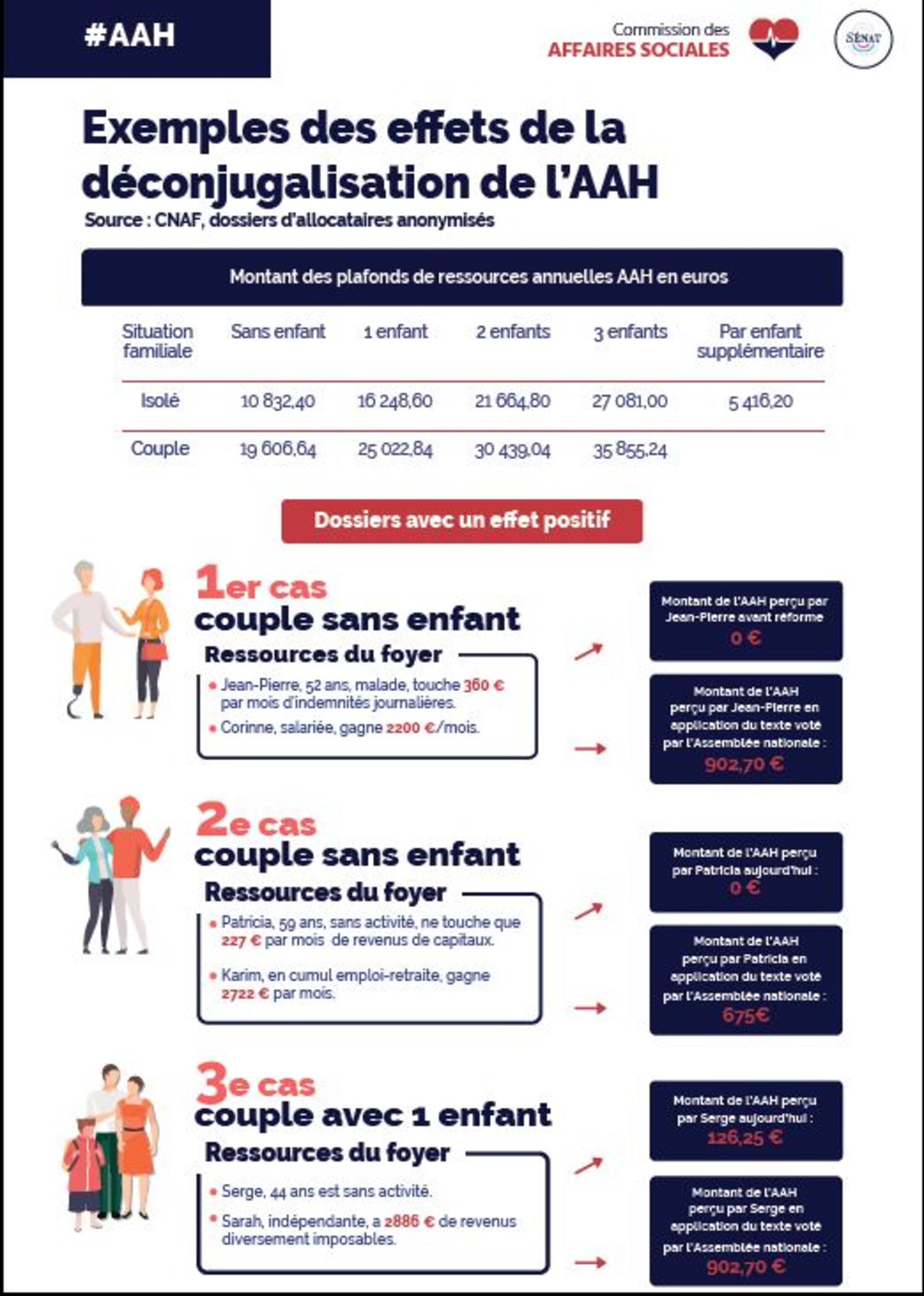La Commission propose des modifications du texte voté par l'Assemblée Nationale. En particulier, un article prévoyait la suppression complète du plafond de ressources : c'est à propos de cet article que Sophie Cluzel disait que çà coûterait 20 milliards € si tous les bénéficiaires avaient désormais le taux plein et si deux millions de personnes handicapées ayant un taux estimé de 50 % l'obtenait. Chiffres certes gonflés (il y a beaucoup de refus d'AAH quand le taux est égal à 50 et moins de 80%, du fait du critère de la restriction durable et substantielle d'accès à l'emploi), mais compréhensibles1.