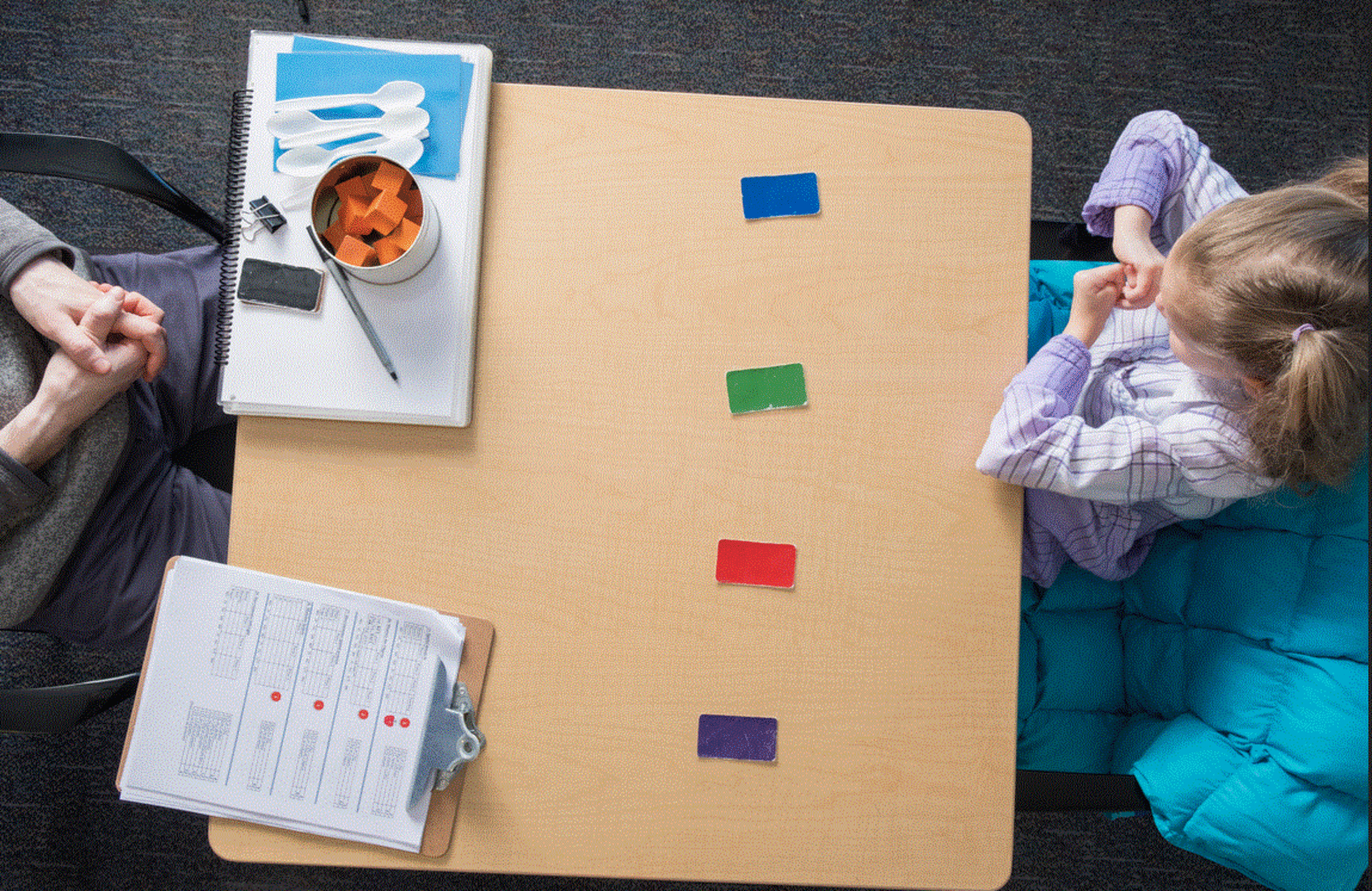 Pour un des groupes de filles, Nelson et ses collègues ont également procédé à des ajustements pour certains éléments du test afin qu'un dispositif de suivi oculaire puisse les aider à évaluer les réponses des enfants. Par exemple, pour un des items, l'examinateur donne habituellement à l'enfant un jeu de crayons de couleur, nomme une couleur et lui demande de désigner le crayon correspondant. L'équipe remplaçait les crayons par des feuilles de papier couleur et surveillait le regard des filles au fur et à mesure que des couleurs particulières étaient nommées.