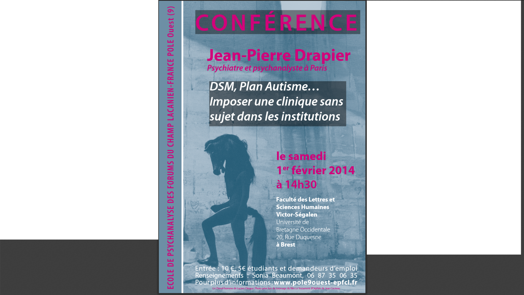 Le samedi 1er février 2014, a eu lieu à la fac de lettres une autre conférence intitulée « DSM, Plan Autisme…Imposer une clinique sans sujet dans les institutions » et présentée ainsi : "Nous avons choisi d’interroger la présence de la psychanalyse dans la cité en ces deux lieux, l’institution et l’université, la présence encore possible d’une pratique et d’un discours.(...)." Cette conférence était destinée à un certain nombre d'étudiants, qui devaient attester de leur présence. Encore une fois, cela a été l'occasion de promouvoir la théorie des mères froides comme origines de l'autisme, de critiquer le diagnostic précoce, le recours à l'orthophonie, de refuser l'accès à des soins adaptés (comme la mélatonine en cas de difficulté d’endormissement). Il est paradoxal de prétendre investir "la cité" en prônant des méthodes qui conduisent à l'exclusion d'une fraction non négligeable de la population (une personne sur 150). [sur youtube]