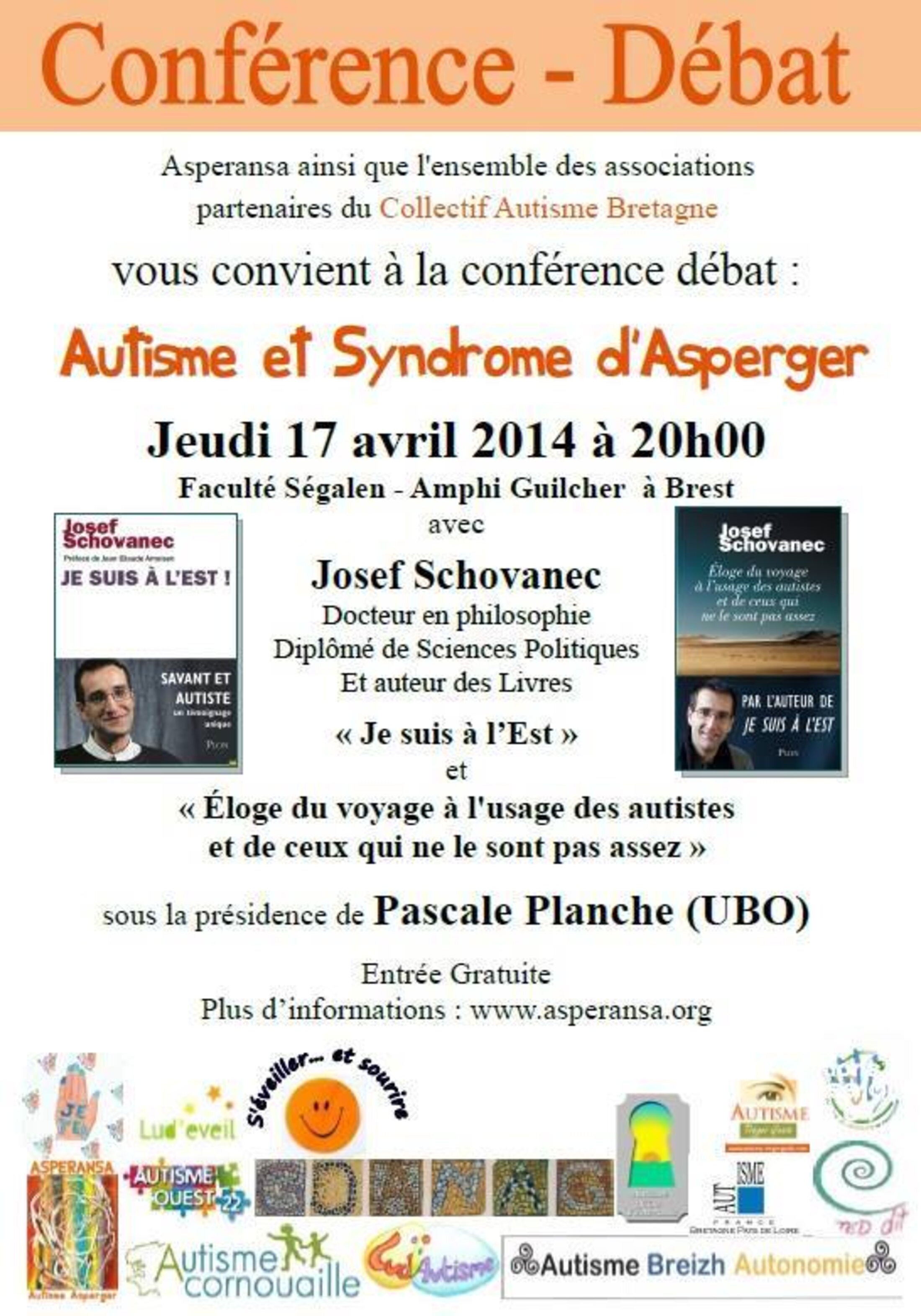 Nous vous proposons donc d’organiser avec vous une ou des conférences sur l'autisme. Nous faisons intervenir Josef Schovanec à Quimper le 22 avril, et il serait disponible pour des conférences à Brest le 18 ou 19 avril. Il captive son auditoire, en donnant beaucoup d'exemples concrets et avec humour. Une information scientifique actualisée sur l'autisme pourrait être faite en même temps.