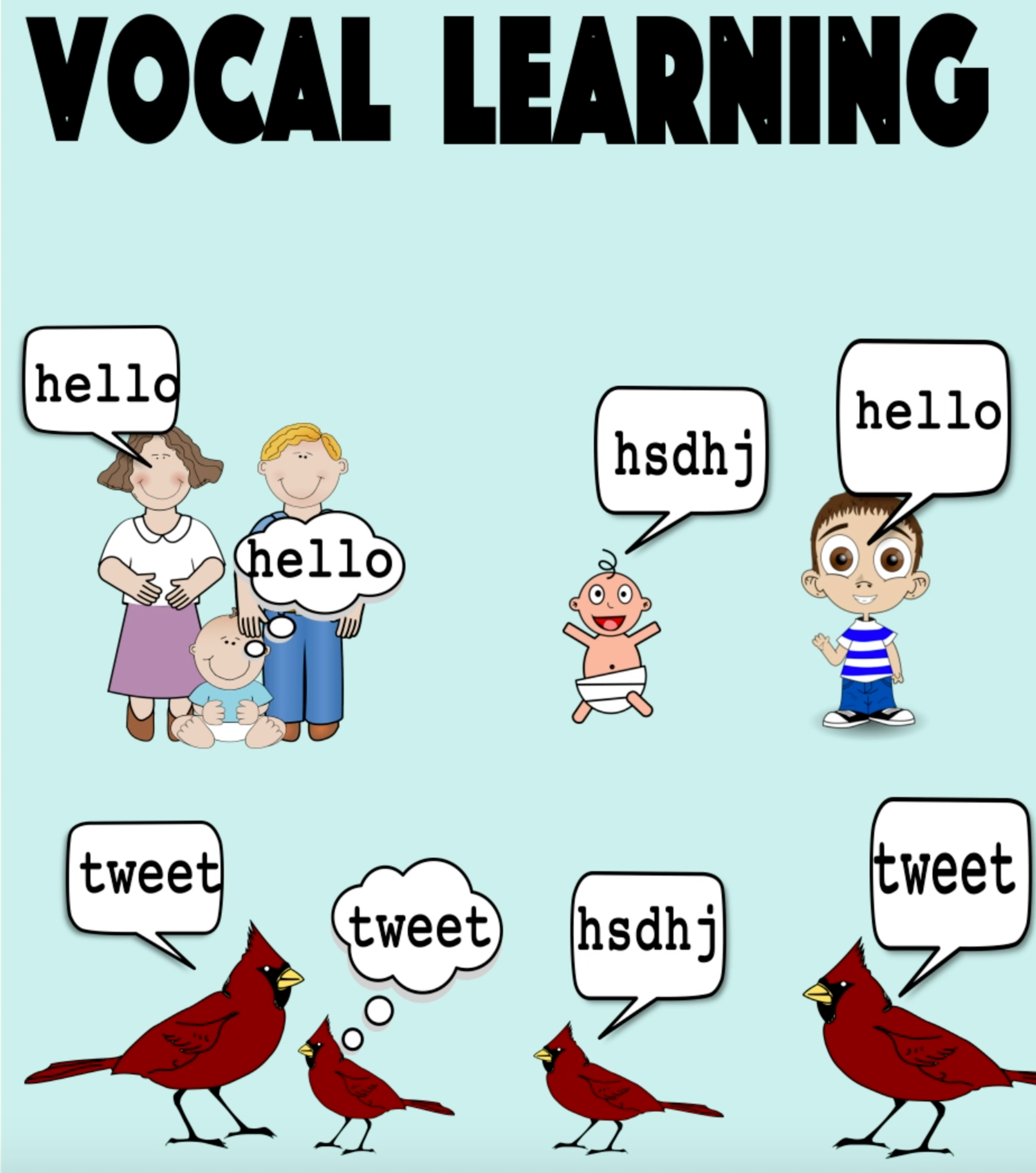 Les oiseaux chanteurs, les perroquets, les colibris et quelques autres animaux apprennent à communiquer selon le modèle de chant ou la langue que leurs parents "parlent". De la même manière que n'importe quel être humain peut apprendre l'anglais, le swahili ou le khoisan, n'importe quel oiseau chanteur peut théoriquement tenter d'imiter le chant d'un bruant à couronne blanche, d'un pinson ou d'un rouge-gorge, explique David Rosenfield, directeur du Houston Methodist's Speech and Language Center. Tout cela est possible grâce à une capacité rare appelée apprentissage vocal.