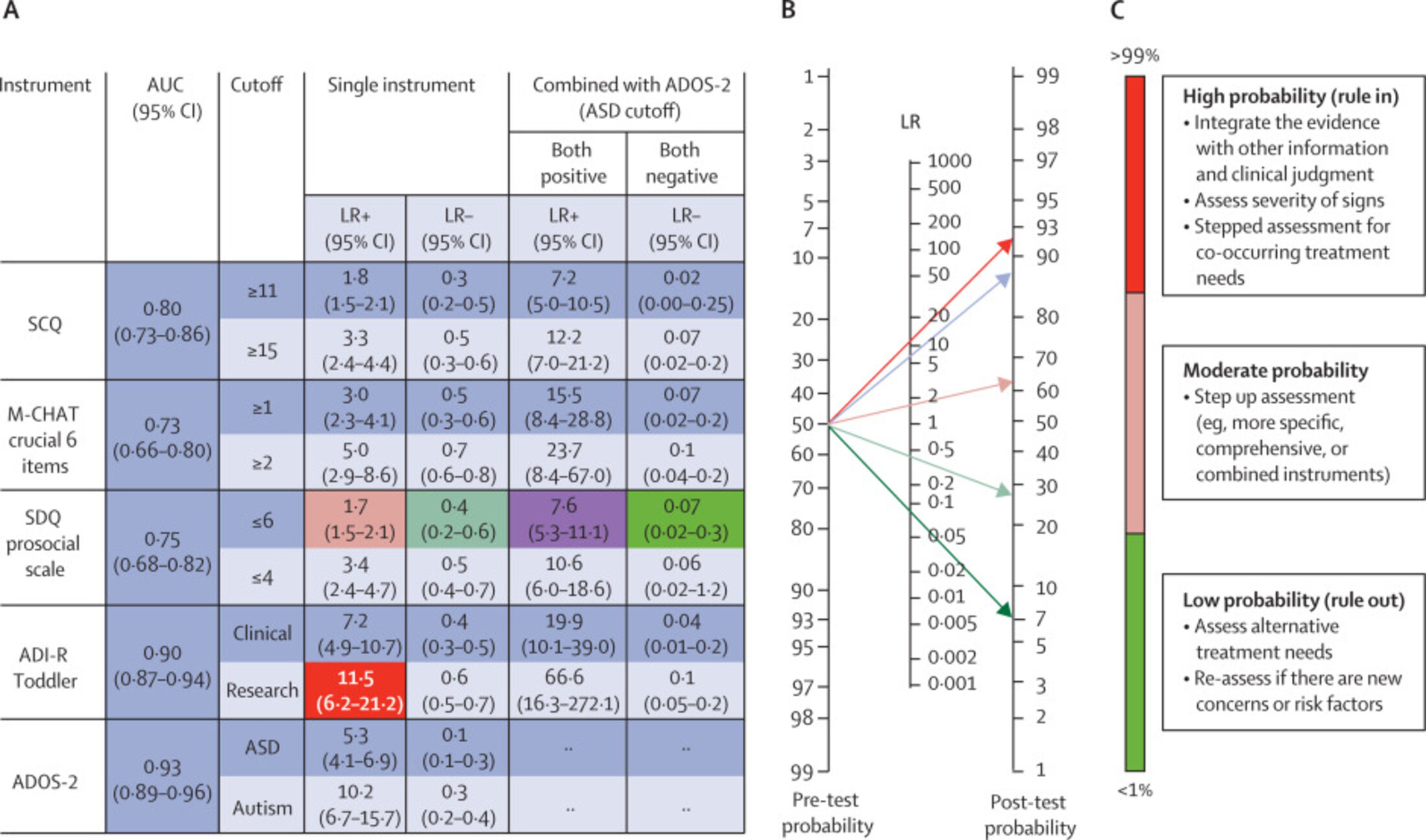 Les RL ont été calculés à partir de la comparaison entre les tout-petits diagnostiqués autistes et ceux atteints d'autres troubles psychiatriques sans autisme dans l'étude de cohorte sur l'autisme à la naissance nichée dans l'étude de cohorte norvégienne sur la mère, le père et l'enfant. Les LR doivent être estimés à partir d'échantillons représentatifs (par exemple, en termes d'âge et de groupe de comparaison) de la population dans laquelle l'instrument est appliqué. L'utilisation de la probabilité révisée d'un instrument comme probabilité de pré-test pour l'instrument suivant exige que les deux instruments soient basés sur des informations différentes et apportent des contributions indépendantes et additives pour prédire le diagnostic, comme le récit des parents dans la vie quotidienne à la maison et l'observation directe de l'interaction avec un adulte non familier. (A) LR d'autisme basé sur les résultats d'instruments uniques et de combinaisons d'instruments basés sur les parents et l'ADOS-2 basé sur le clinicien. (B) Exemple d'un tout-petit avec une probabilité de départ de 50 % d'être autiste. Un score prosocial SDQ de 6 ou moins augmenterait la probabilité d'autisme à 63 % lorsqu'il est considéré seul (rouge clair), et à 88 % s'il est combiné à un résultat ADOS-2 supérieur au seuil des troubles du spectre de l'autisme (violet). En revanche, un score prosocial SDQ de niveau moyen (>6) réduirait la probabilité à 29 % (vert clair) lorsqu'il est considéré seul, et à 7 % s'il est associé à un score ADOS-2 inférieur au seuil des TSA (vert foncé). Dans certains cas, un seul résultat d'instrument pourrait modifier la probabilité suffisamment pour dépasser le seuil d'inclusion ou d'exclusion (rouge). (C) Seuils permettant d'exclure ou d'admettre un diagnostic ou un besoin de service, qui doivent être personnalisés. ADI-R=Autism Diagnostic Interview, Revised. ADOS-2=Autism Diagnostic Observation Schedule, 2nd edition. ASD=autism spectrum disorder. AUC=area under the receiver operating characteristic curve. LR=likelihood ratio. LR+=positive likelihood ratio. LR–=negative likelihood ratio. M-CHAT=Modified Checklist for Autism in Toddlers. SCQ=Social Communication Questionnaire, SDQ=Strengths and Difficulties Questionnaire
