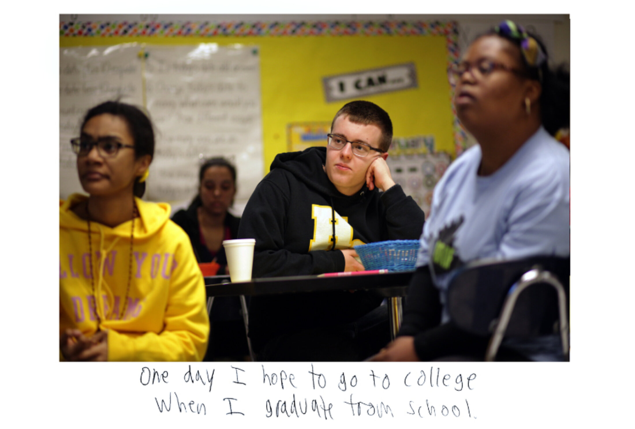 Erin Lefevre : J’ai commencé ce projet en 2014, alors que Liam avait 14 ans, cela fait maintenant cinq ans que je le suis. A l’époque, je commençais à apprendre la photographie documentaire à l’Institut des Arts de San Francisco. Le voir passer de la préadolescence à l’âge adulte m’intéressait. Au fur et à mesure que nous avancions, j’ai commencé à avoir l’impression qu’il manquait quelque chose. Quand je montrais ce travail, on me renvoyait des commentaires frustrants comme « On ne dirait pas que quelque chose ne va pas chez lui. » Mais je ne voulais pas montrer que quelque chose chez lui n’allait pas. Ce que je voulais exprimer, c’est qu’il voit le monde différemment. Un jour, j’ai décidé de lui faire rédiger des légendes. C’est à ce moment que le projet a vraiment commencé.