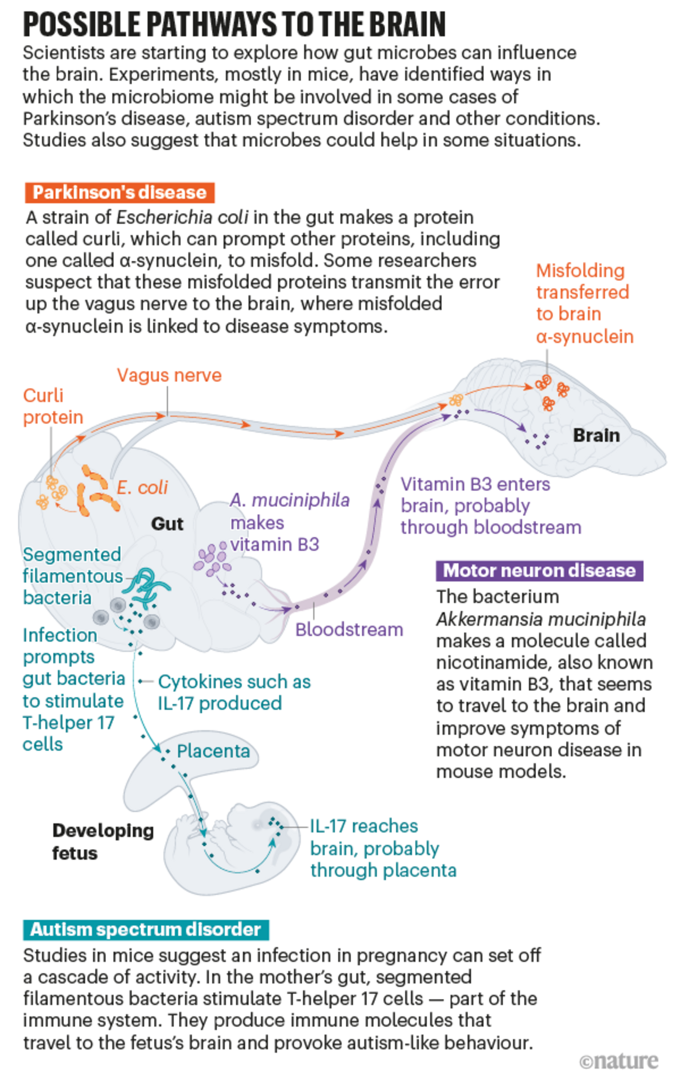 Ces dernières années, cependant, le domaine a fait des progrès significatifs, dit O'Malley. Plutôt que de parler du microbiome dans son ensemble, certaines équipes de recherche ont commencé à creuser pour identifier des microbes spécifiques, en traçant les voies complexes et parfois surprenantes qui les relient au cerveau. "C'est ce qui permet d'établir des attributions causales", dit-elle. Des études sur les souris - et des travaux préliminaires sur les humains - suggèrent que les microbes peuvent déclencher ou modifier l'évolution de conditions telles que la maladie de Parkinson, les troubles du spectre autistique et bien d'autres (...). Les thérapies visant à modifier le microbiome pourraient contribuer à prévenir ou à traiter ces troubles, une idée que certains chercheurs et entreprises testent déjà dans le cadre d'essais cliniques chez l'homme.