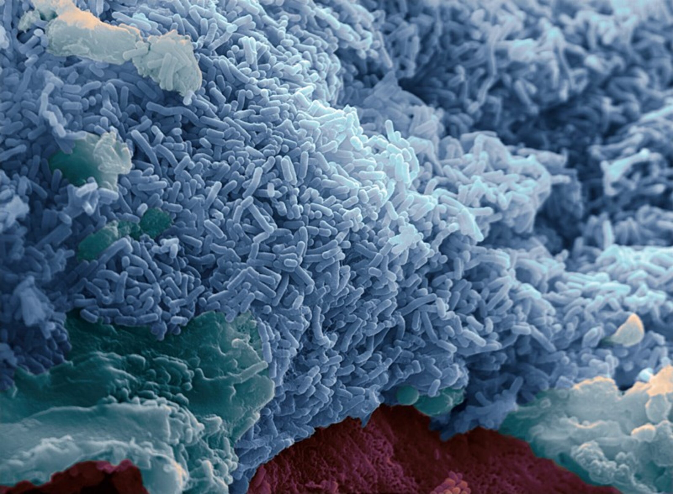 Micrographie de la bactérie Lactobacillus reuteri en forme de bâtonnet dans la couche de mucus de l'intestin grêle d'un être humain