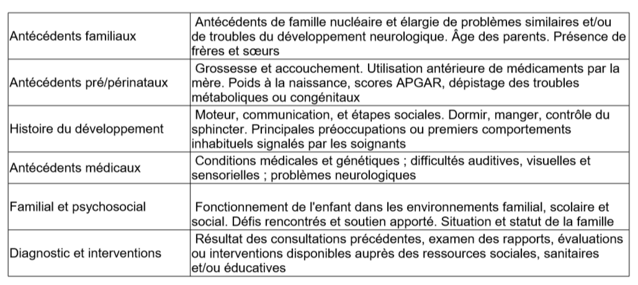 L'évaluation diagnostique doit commencer par un historique clinique détaillé afin d'établir la trajectoire de développement de l'individu, ses antécédents médicaux, son niveau de développement et les facteurs familiaux ou sociaux pertinents (voir tableau 5) [5].