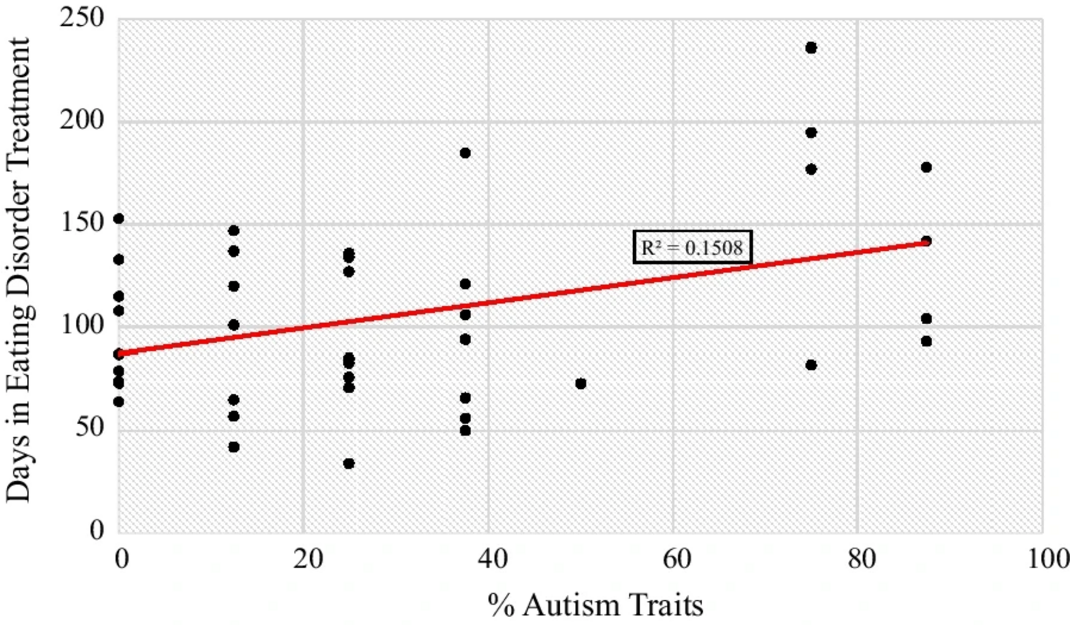 Il est bien établi que l'autisme et les troubles de l'alimentation coexistent souvent. Les femmes sont moins susceptibles d'être diagnostiquées autistes et tendent à recevoir un diagnostic plus tard dans leur vie que les hommes. Par conséquent, lors du traitement des troubles de l'alimentation à des niveaux de soins plus élevés, les professionnels des troubles de l'alimentation peuvent être les premiers à reconnaître l'autisme chez leurs patientes. Un examen des dossiers d'adolescentes et de jeunes adultes traitées pour des troubles de l'alimentation dans le cadre d'une hospitalisation partielle entre 2020 et 2022 a révélé que 10 % d'entre elles avaient reçu un diagnostic d'autisme au début du traitement et que 17,5 % ont reçu un nouveau diagnostic au cours du traitement. Le nombre de traits autistiques présents chez un individu est en corrélation directe avec des durées de traitement plus longues.