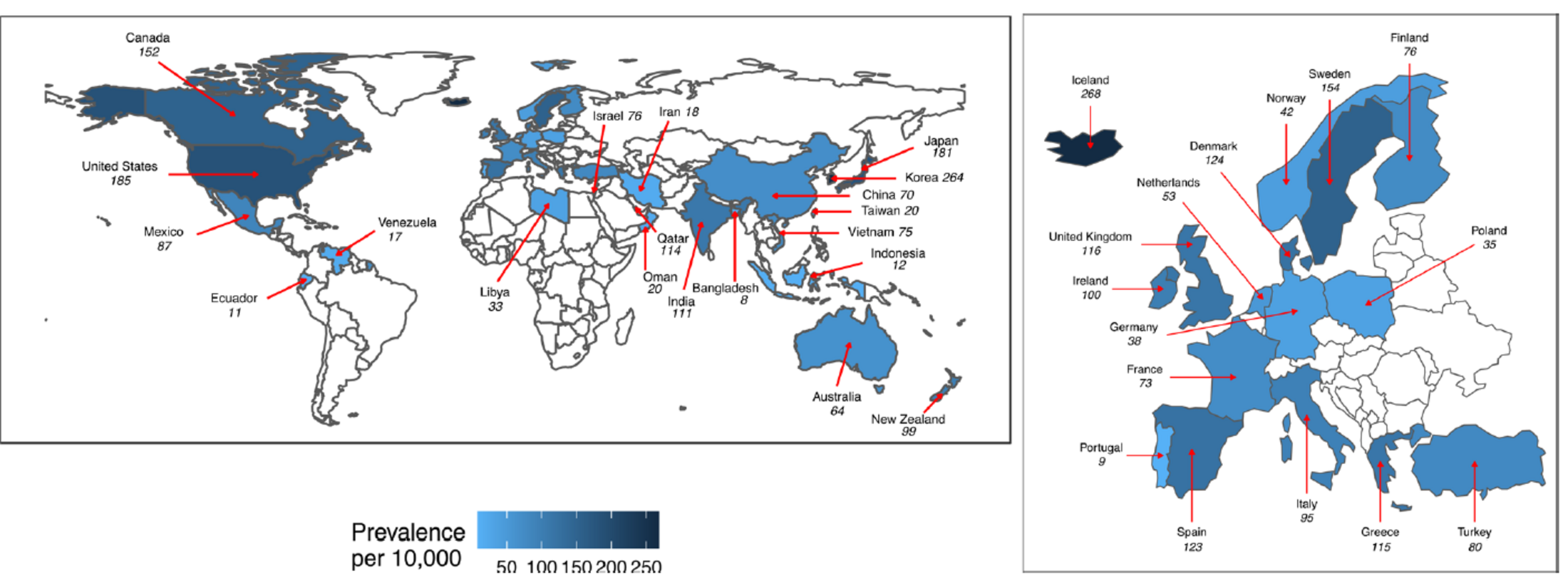 Fig. 1 Prévalence des TSA pour 10 000 habitants dans 37 pays (carte du monde à gauche, encart Europe à droite)