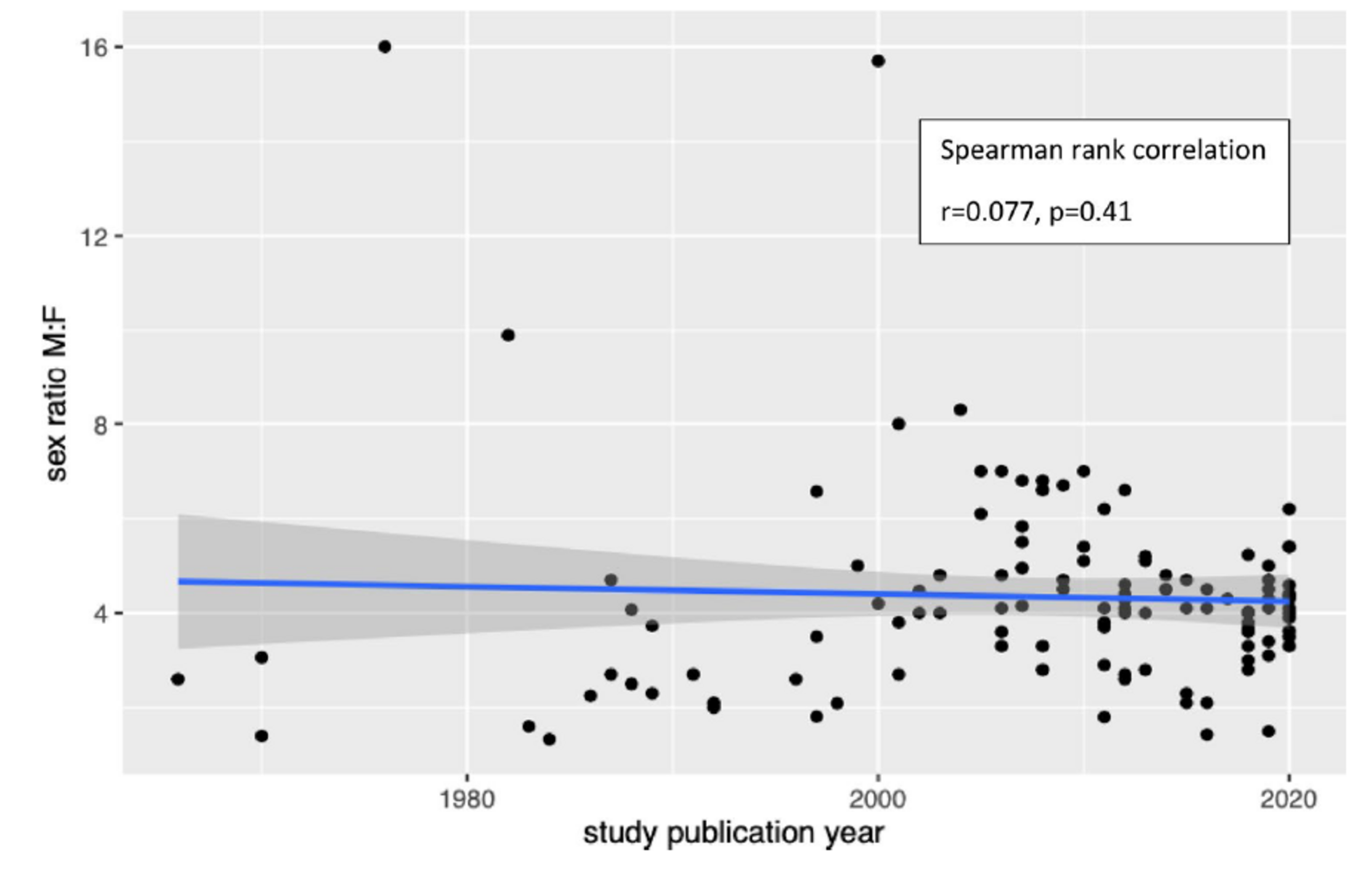 La prépondérance masculine dans l'autisme est une caractéristique bien reconnue de ce trouble, qui a été confirmée par des décennies de recherche. Dans un examen de 29 enquêtes publiées jusqu'en 2001, nous avions déjà signalé un ratio moyen hommes/femmes de 4,3 (Fombonne, 2003). Et dans notre dernier examen global de 141 enquêtes publiées de 1966 à 2020, un sex-ratio médian de 4,1 a été obtenu à partir de 117 études comportant des données sur le sexe (Fombonne et al., 2021a) ; de même, la moyenne pondérée par la taille de l'échantillon était de 4,13. Un sex-ratio de 4,1 équivaut à l'observation de 80-81% de mâles dans les échantillons étudiés. Comme l'illustre la figure 2, ce sex-ratio n'a pas changé au fil du temps, comme le montre la corrélation de Spearman non significative entre le sex-ratio et l'année de publication (figure 2).
