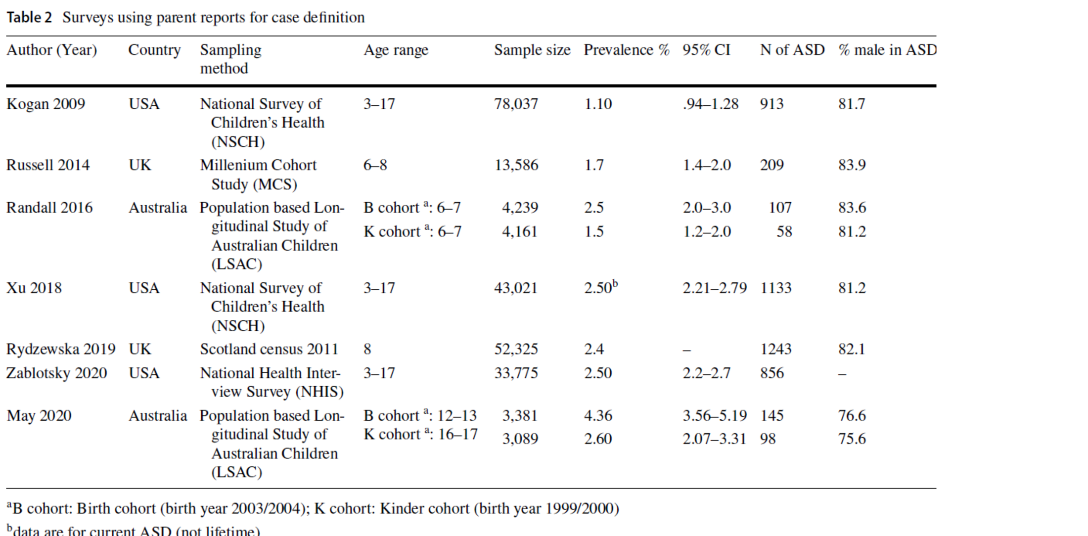 Après une brève revue de la littérature sur l'autisme, nous nous penchons ici sur des domaines spécifiques de la méthodologie d'enquête dans lesquels des progrès ont été réalisés ou sont encore nécessaires. Nous renvoyons les lecteurs intéressés par une analyse plus détaillée à nos articles (Fombonne et al., 2021a ; MacFarlane et al., 2021) et commentaires (Fombonne, 2018 [Traduction], 2019) les plus récents, ainsi qu'à ceux d'autres chercheurs (Chiarotti & Venerosi, 2020 ; Jinan et al., soumis). Il convient de noter que la portée de ces analyses se limite aux études de prévalence de l'autisme et ne comprend pas les études sur les facteurs de risque environnementaux. De plus, chaque étude a utilisé des critères d'inclusion et d'exclusion légèrement différents ; il est donc recommandé de les consulter l'une après l'autre pour avoir une vue d'ensemble complète.
