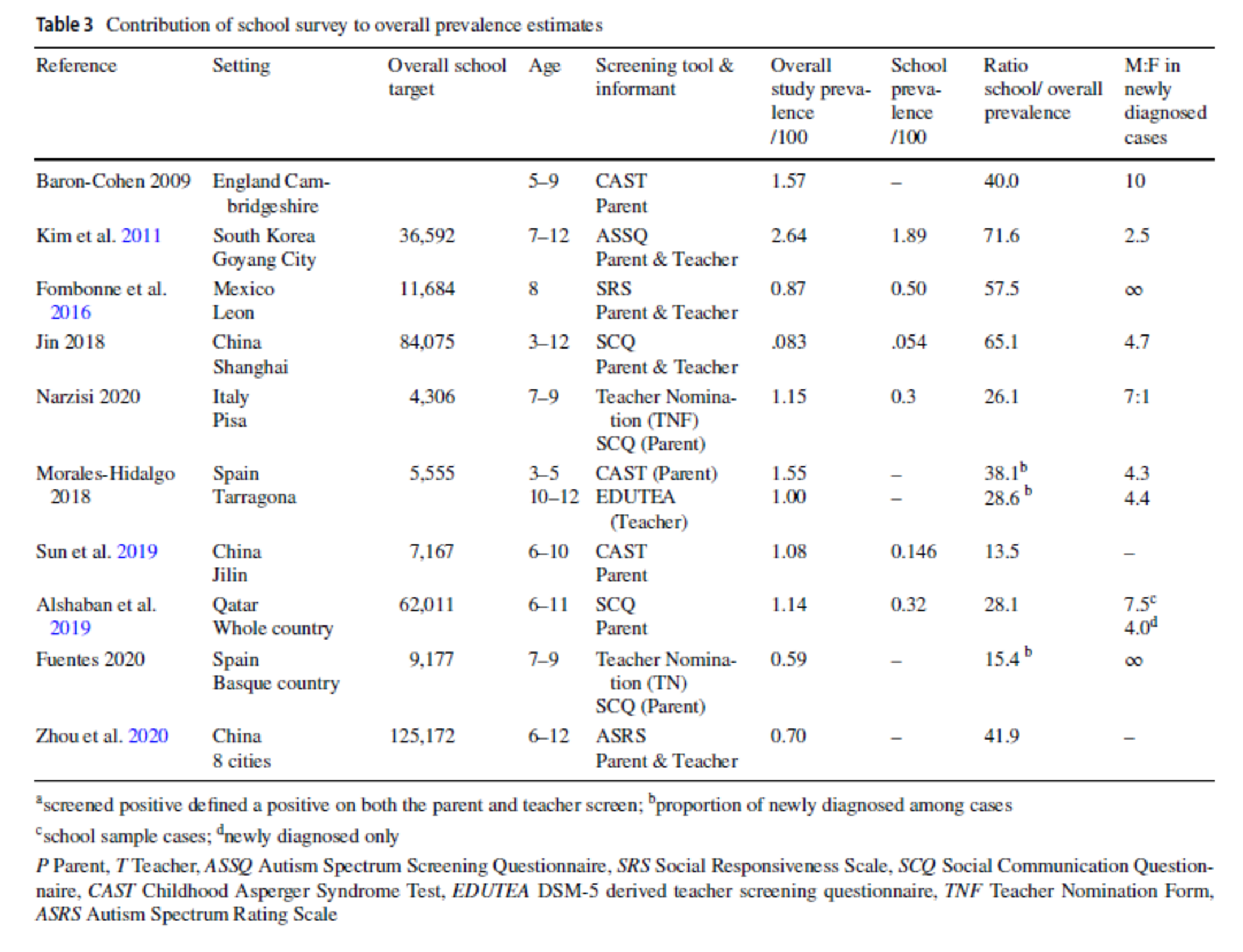 confirmant que le dépistage des enfants scolarisés permet d'identifier de nouveaux cas qui auraient autrement été manqués par la méthodologie précédente reposant sur des enfants déjà diagnostiqués avec une certaine forme de handicap. De plus, dans chaque enquête, la contribution relative de la composante de la prévalence scolaire à la prévalence globale de la population variait de 13 à 72 % (médiane : 33 %, 10 enquêtes du tableau 3). Il est probable que cette grande variation reflète des différences dans la méthodologie d'enquête en milieu scolaire dans ces études, bien qu'elle puisse également refléter de véritables différences entre les populations dans la proportion d'enfants diagnostiqués/non diagnostiqués. Malheureusement, il n'existe aucun moyen de tester ces interprétations concurrentes. Les preuves préliminaires actuelles (tableau 3) suggèrent néanmoins que jusqu'à un tiers des cas d'autisme dans une population pourraient être manqués dans les études qui n'enquêtent pas dans les écoles.