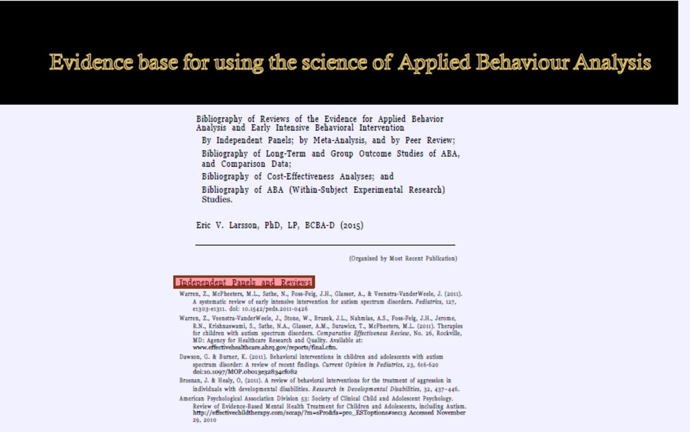 larsson-2015-research-on-aba-and-eibi-for-autism-evidence-refsVous trouverez aussi en pièce jointe un article vous montrant pourquoi les RCT [Randomised Controlled Trials - essais randomisés avec groupe contrôle] ne sont pas un outil approprié à la collecte de preuves pour les interventions personnalisées.