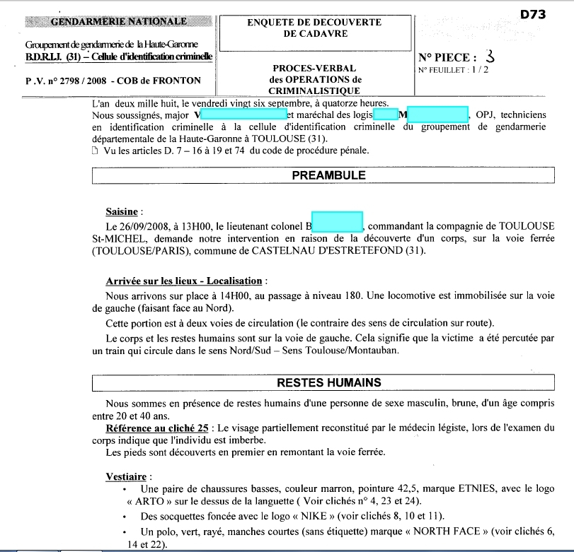Je vais donner celà pèle-mèle. Je ne peux pas publier le dossier en l'état avec les noms des enquêteurs magistrats etc....