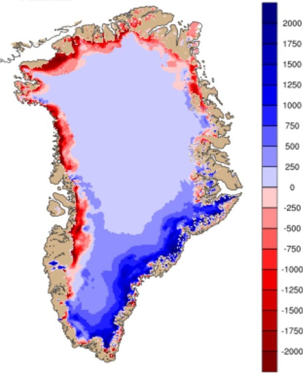 Les zones bleues indiquent une croissance de la glace, tandis que les zones rouges indiquent les pertes et sont minuscules en comparaison. SMD écrit: « La carte du bilan de la masse de surface cumulée (en mm d’équivalent en eau) à partir du 1er Septembre 2014 à ce jour. (aout 2015) » Source: http://www.dmi.dk/mass-budget/.