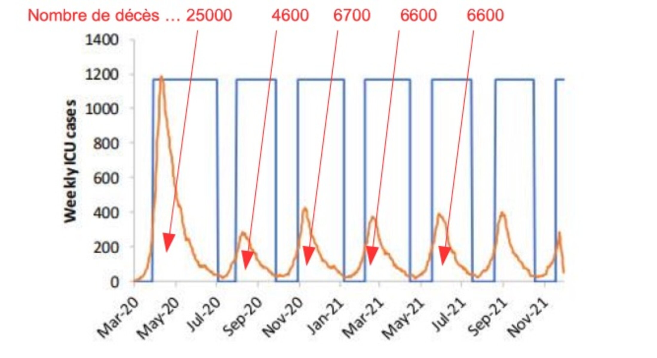 - mais comme on est très malin, on appuie « à temps » sur le bouton STOP… Entendez : on re-confine provisoirement juste avant que les services de réanimation ne saturent à nouveau !