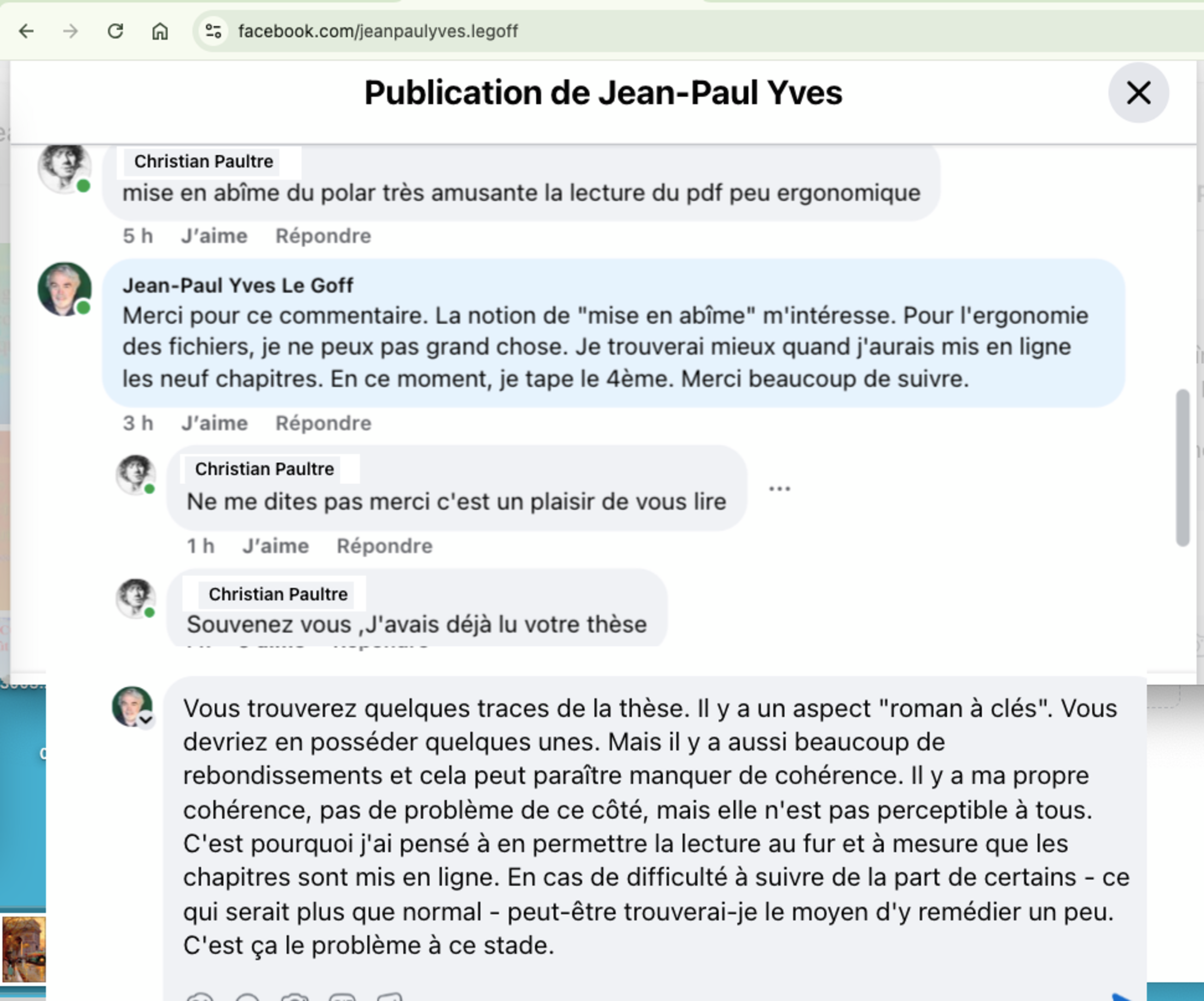 Les six autres chapitres sont écrits et en cours de mise en ligne. Mais ils sont modifiables, en fonction des éventuelles remarques. C'est pourquoi, elles m'intéressent particulièrement.