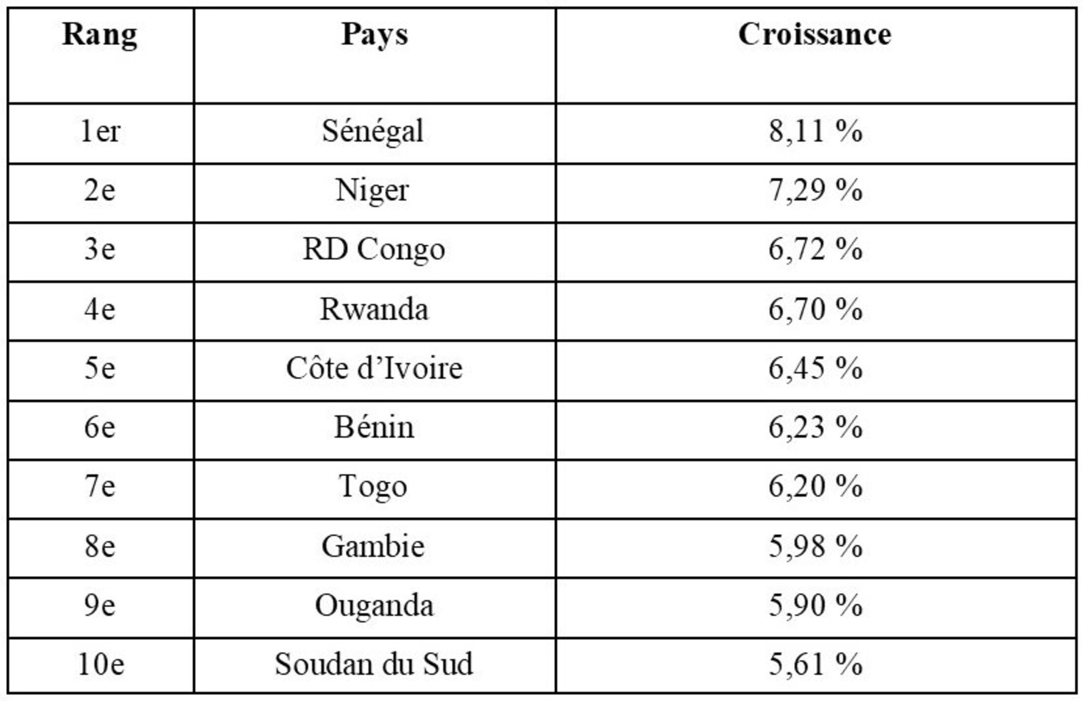 La palme devrait revenir au Sénégal avec une croissance prévisionnelle estimée à 8,11%. Le Niger arrive en 2e place avec une projection de croissance de 7,29%. La République démocratique du Congo devrait afficher la 3e meilleure performance en Afrique subsaharienne en termes d’évolution du produit intérieur brut, avec une croissance de l’ordre 6,72%. Ceci, grâce notamment à un meilleur apport de son important secteur minier qui bénéficie de la forte demande des minerais stratégiques pour la transition énergétique (cobalt, lithium, cuivre, graphite…). Quant au Rwanda, 4e, sa croissance, comme lors des précédentes années, sera tirée par les services dont le pays a fait sa locomotive (Les dépêches de Brazzaville, i janvier 2023).