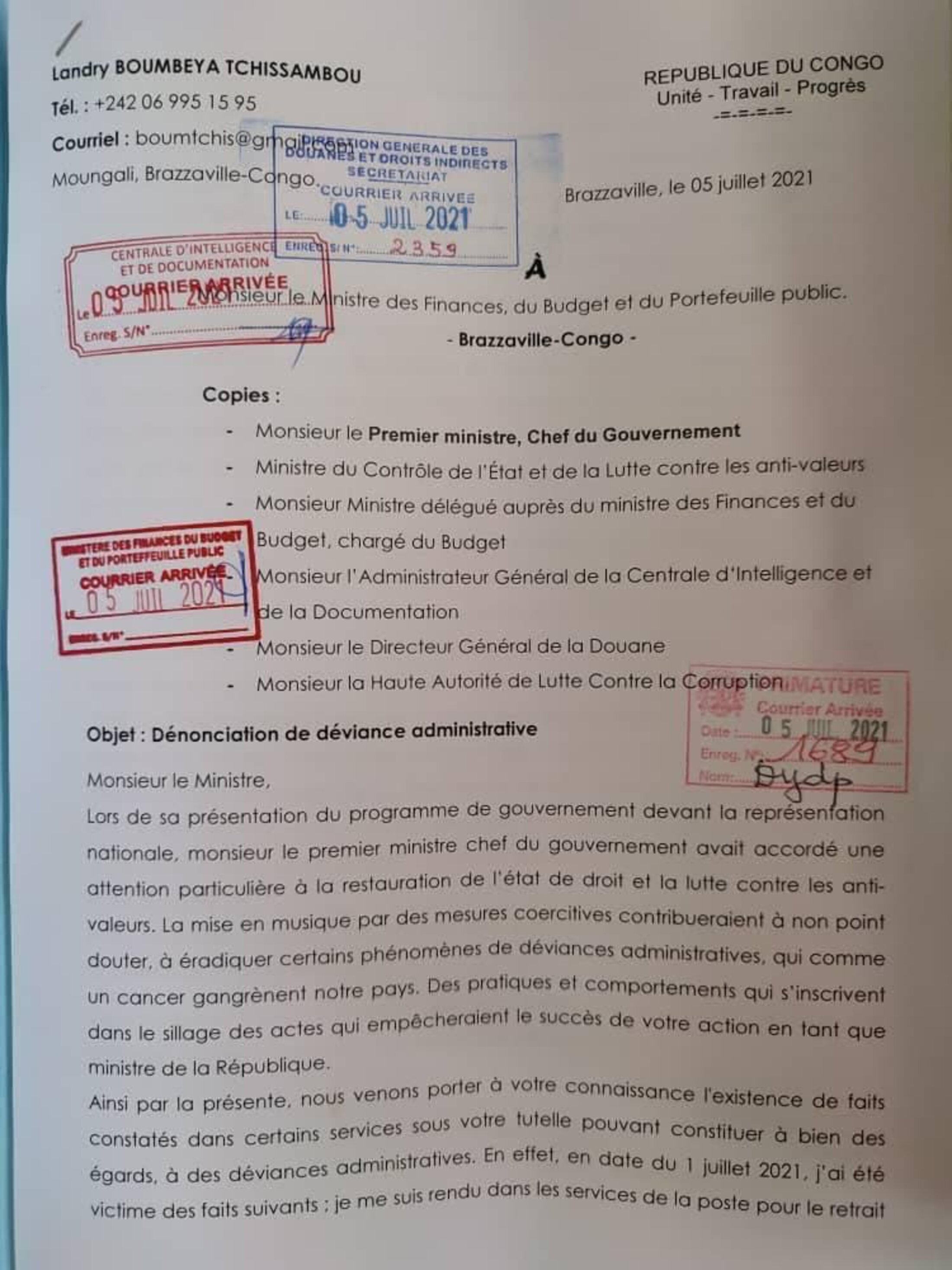 Voici la lettre pour laquelle M. Landry Boumbeya Tchissambou a été envoyé en prison.