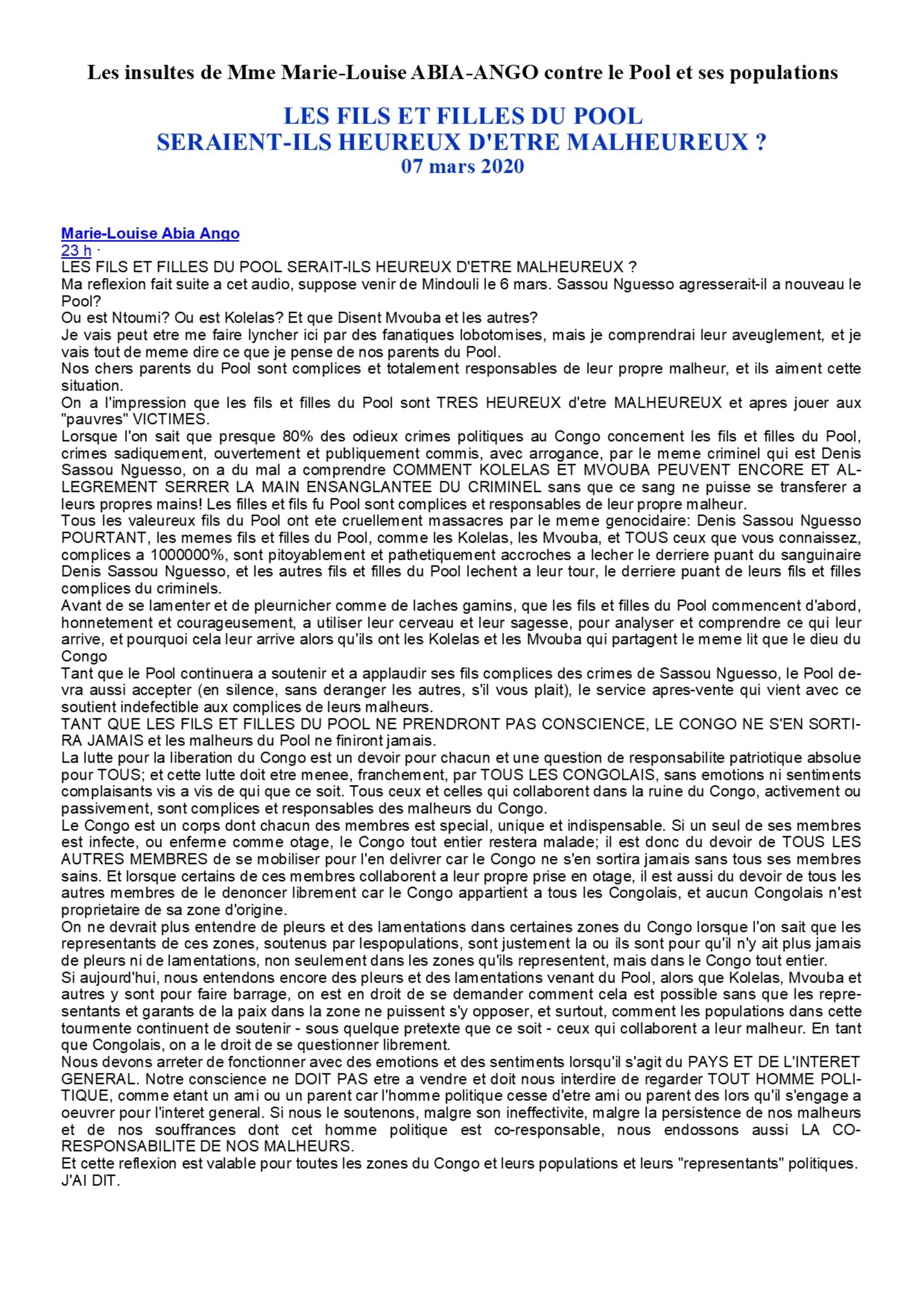 Marie-Louise Abia est incapable de récupérer le pouvoir qu'ils ont bêtement remis à Sassou en trahissant Lissouba. Mais comme ils sont lâches, ils veulent pousser les populations du Pool, en les provoquant, à se révolter et leur servir de chair à canon. Parce que, en écrivant : "ON A L'IMPRESSION QUE LES FILS ET LES FILLES DU POOL SONT TRES HEUREUX D'ÊTRE MALHEUREUX ET APRES JOUER AUX "PAUVRES" VICTIMES", Marie-Louise Abia Ango veut leur dire en clair : "Avec tout ce qu'on vous fait, qu'est-ce que vous attendez pour vous révolter... ?" Comme ça, après le carnage, elle et ses parents, les charognards, iront ramasser ce que les populations du Pool leur auront permis de récupérer. Or les lâches ce sont les Nibolek qui ont vite déposé les armes et ont vite conclu un accord de paix avec celui qui leur repris le pouvoir acquis démocratiquement, comme l'admet l'autre ancien repris de justice pour escroquerie en bande organisée. Ils envisagent une solution militaire pour récupérer leur pouvoir perdu par la trahison des Béembés de la Bouenza, mais pour cela ils comptent sur la révolte des Laris du Pool qu'ils détestent comme la peste. La preuve, Marie-Louise Abia Ango les insultes copieusement tout en leur demandant de l'aider à récupérer son pouvoir. Le papier de Marie-Louise Abia Ango, je vais le conserver aussi longtemps que possible jusqu'au jour où je le lui mettrai sous son nez et qu'elle m'explique de vive voix. Qu'elle continue de se moquer de nous. Pour obtenir ce qu'elle veut, ce n'est pas comme ça qu'elle l'obtiendra en insultant les gens qui souffrent, des gens qui n'ont rien fait à personne, mais qui payent à la place des Nibolek pour l'affaire de 1959. Alors ne comptez pas sur les cadavres des populations du Pool et des Laris pour aller vous asseoir dans le fauteuil que vous avez remis à Sassou par votre propre trahison.