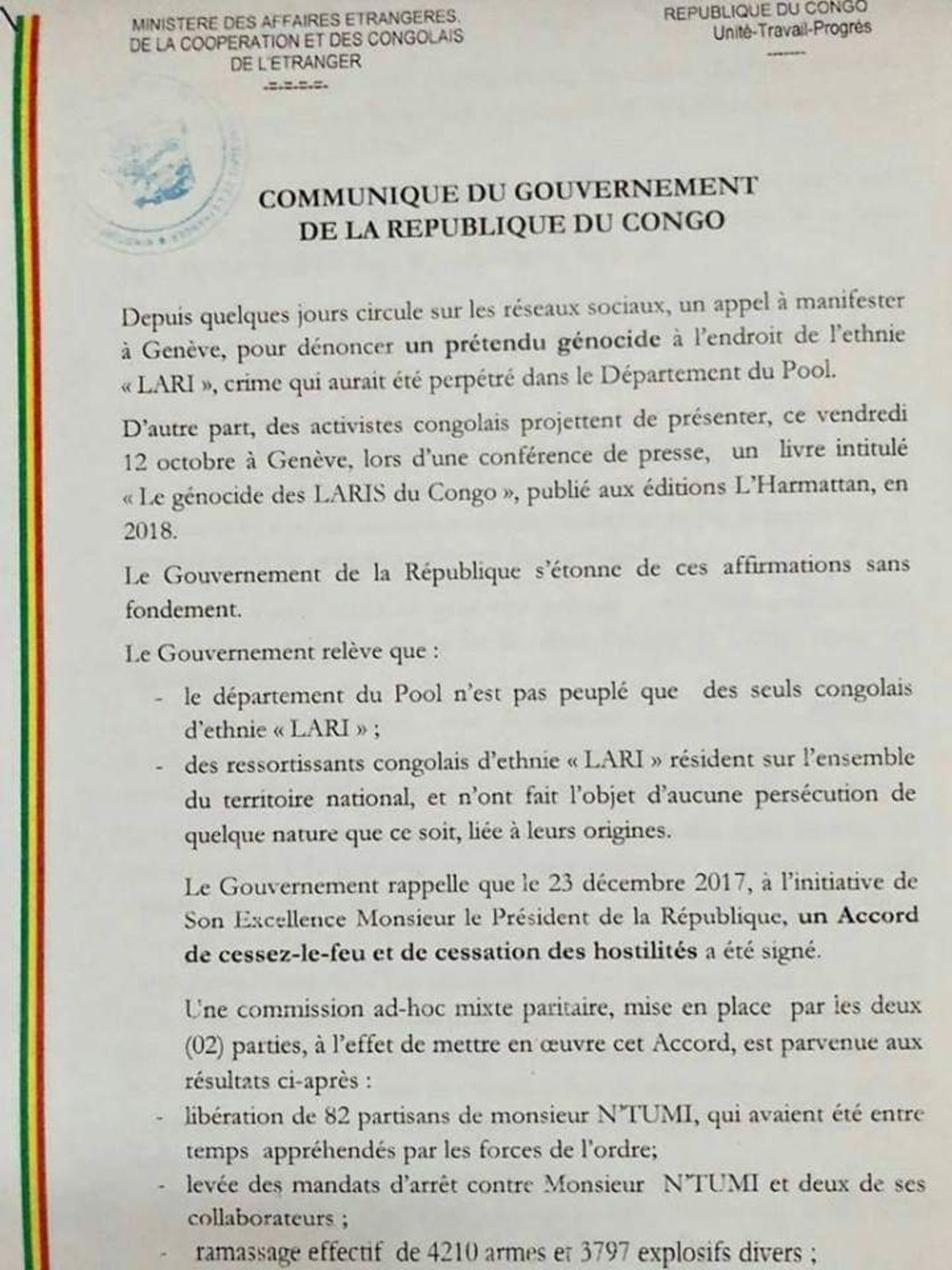 D’où la précipitation du “*démenti gouvernemental*” qui n’est autre qu’un aveu criard qui démontre que Denis Sassou Nguesso est bel et bien un GÉNOCIDAIRE et que « la réconciliation inter-nordiste prônée par Sassou Nguesso » a conduit à la politique d’extermination des Lari dans le Pool en écho à Mberi Martin qui déclarait : “*Les Lari doivent se sentir étrangers chez eux*”.