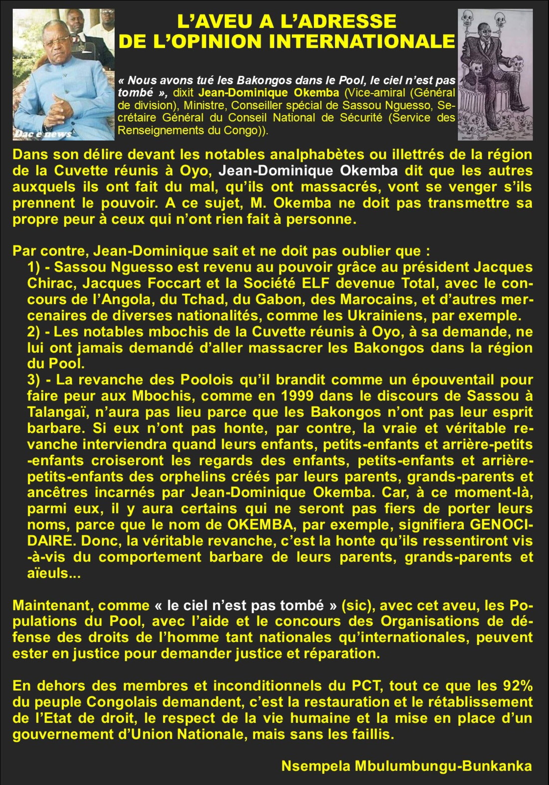 On comprend donc pourquoi Jean-Dominique OKEMBA se vante en disant : « Nous avons tué les Bakongos dans le Pool, le ciel n’est pas tombé ».