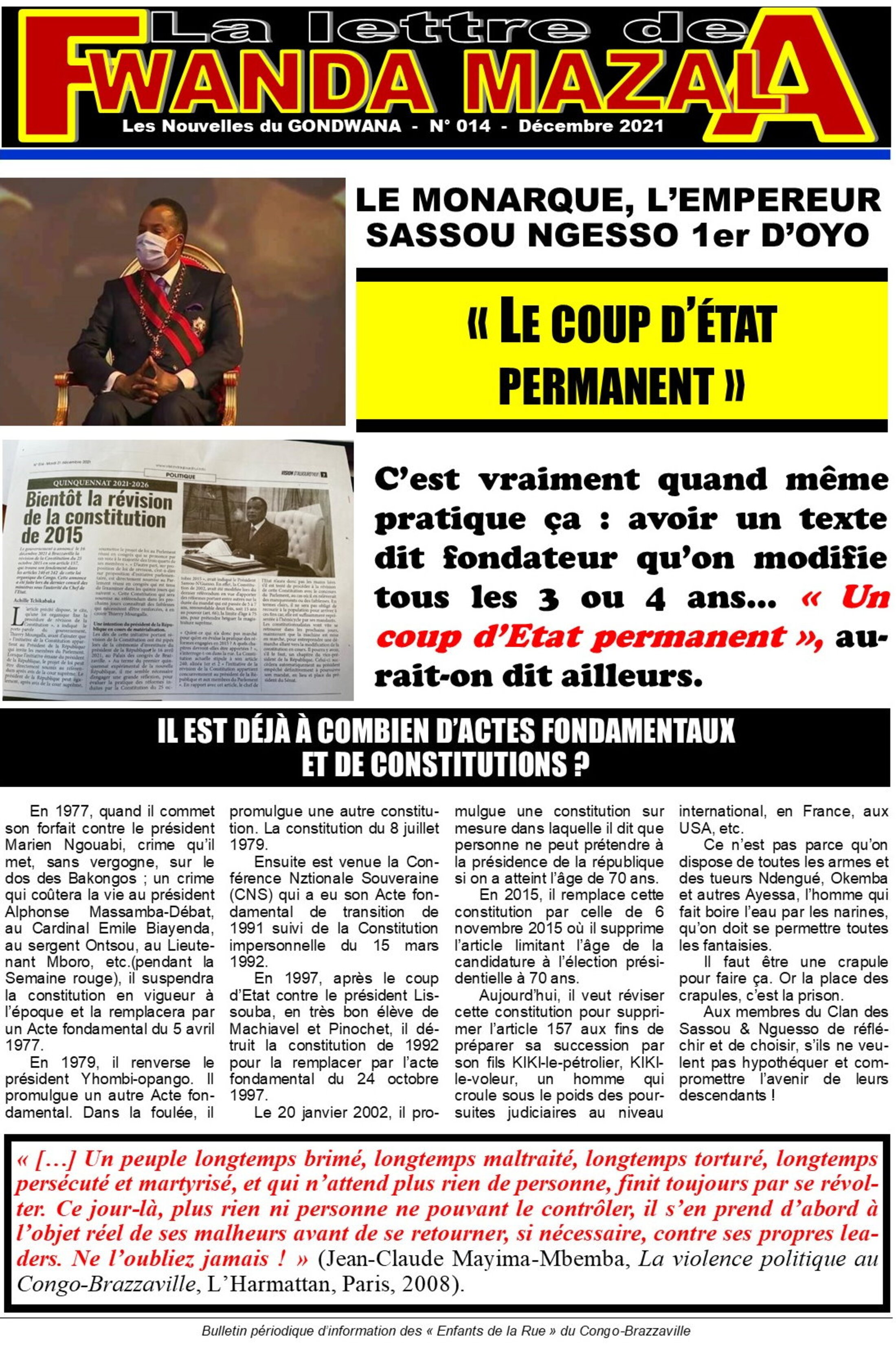 Le serment de Sassou Nguesso fait le 30 novembre 1992, lors du meeting URD-PCT et Apparentés au boulevard des Armées dit, je cite : « J’insiste pour dire que lorsque la constitution est violée, les démocrates ne doivent pas l’accepter ».