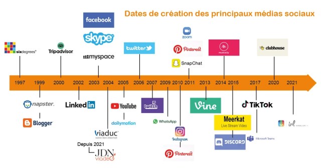Facebook a été crée en 2004, suivi de Youtube en 2005, Twitter en 2006, WhatsApp en 2009 puis Instagram en 2010 et enfin Snapchat en 2011. YouTube est le premier média social à dépasser les 100 millions d’utilisateurs en 2007. En 2013, c’est Facebook qui devient le leader des réseaux sociaux ou plus largement des médias sociaux* avec ses 500 millions d’utilisateurs actifs.
