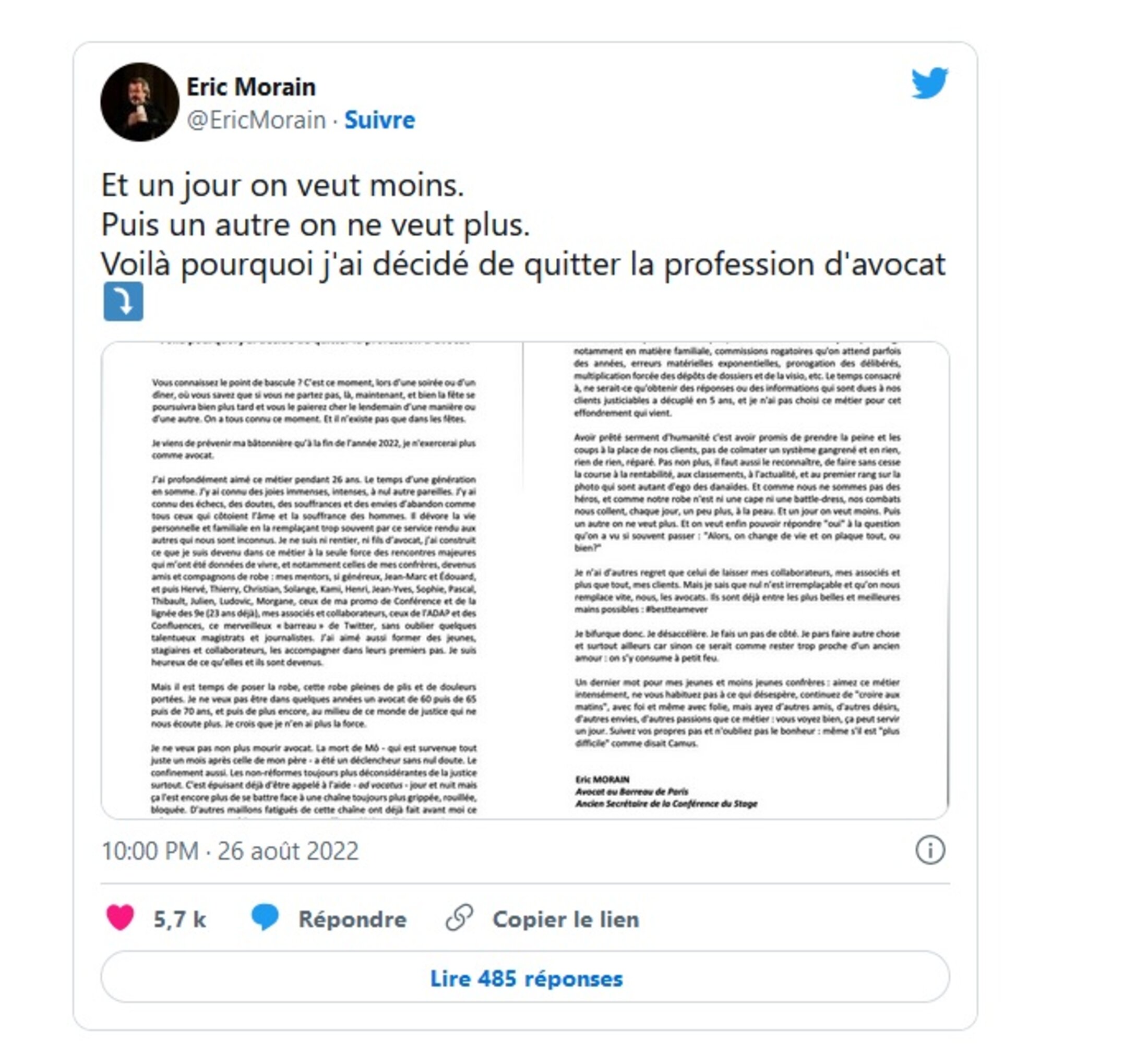 L’avocat Eric Morain, classé parmi les 30 avocats les plus puissants de France par le magazine GQ en 2019, devenu l’un des ténors du barreau de Paris, annonce le 26 août 2022 qu’il quitte la profession d’avocat dans une lettre rendue publique.