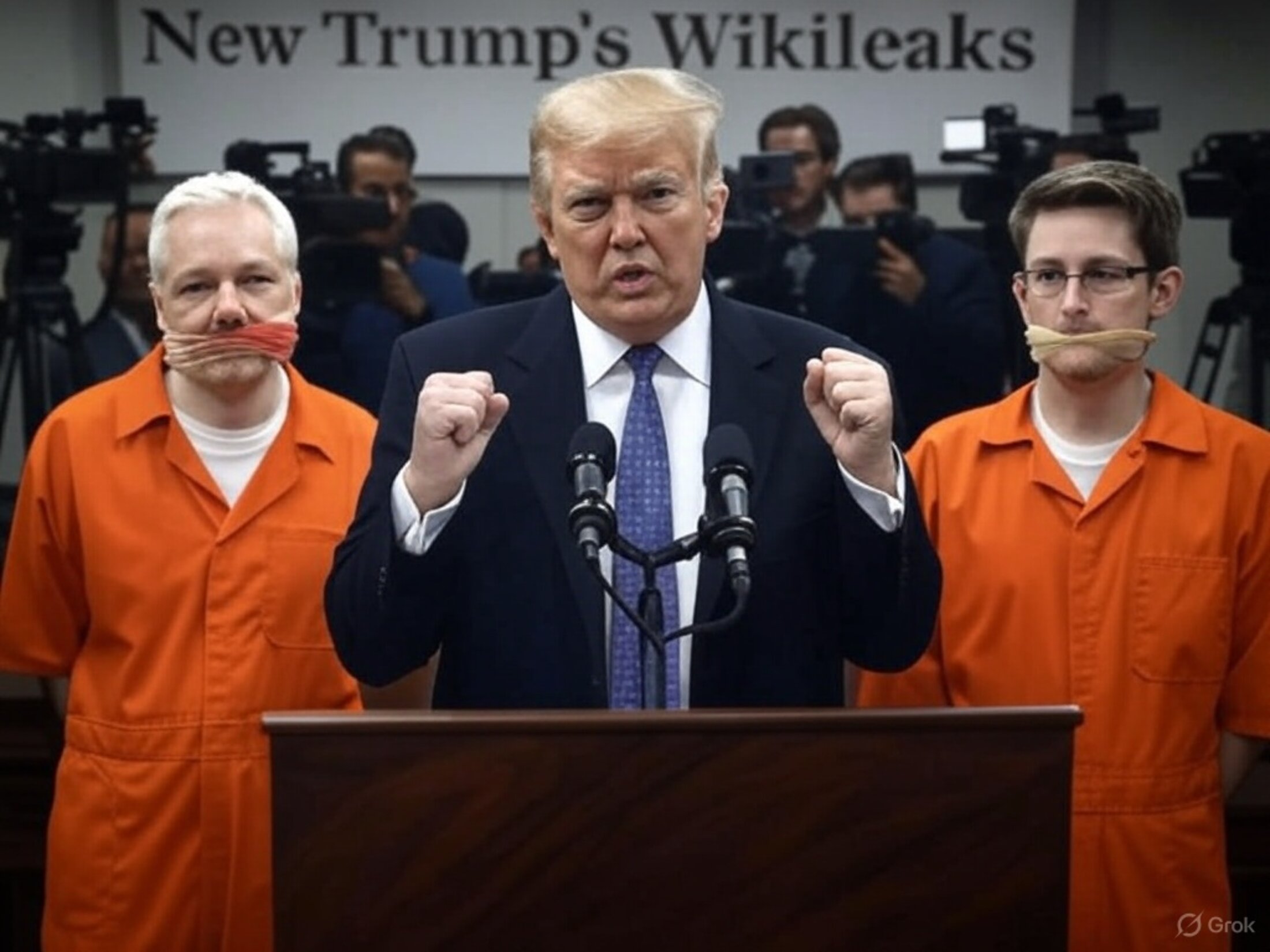 Images sélectionnées parmi celles générées par l'IA Grok-3 promptée par "Au pupitre de la Salle de conférence de presse de la Maison Blanche. Une foule de journalistes, de nombreuses cameras et micros. Julian Assange et Edward Snowden sont bâillonnés, en combinaison orange de Guantanamo, les mains attachées. Devant, Donald Trump et Elon Musk en costumes cravate, parlent déterminés et autoritaires. Derrière, une grande banderolle annonce lisiblement The New WikileaX."