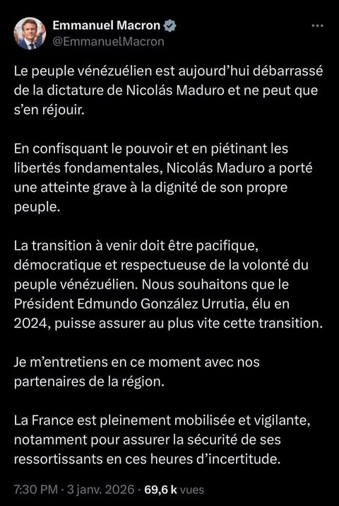 Il en va de même pour le Vénézuéla. Accepter les bombardements à Caracas et la séquestration de son chef d’État, c’est accepter que l’Ukraine soit envahie et Zelensky démis. Car le deux poids deux mesures ne fonctionne pas en droit international.