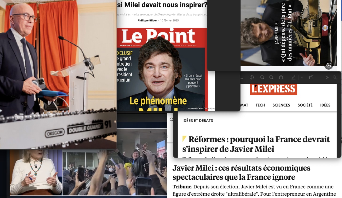 Depuis deux ans, éditorialistes, hommes politiques, économistes, hebdos de droite, d’extrême-droite, libéraux, néolibéraux, illibéraux et certains bobos, avez tous cajolé ou brandi la tronçonneuse. En louvoyant, en roucoulant ou en applaudissant, vous avez chanté les louanges des coupes budgétaires. « Nécessaire », « pourquoi ne pas essayer ? », « regardez l’Argentine, ça fonctionne », sont les termes qui peuplaient vos médias. Et ce ne sont pas que les chiens de Bolloré qui ont aboyé la chanson du « miracle » économique de Milei. De Le Point à Public Sénat, en passant par les «chiffres macroéconomiques intéressants » des journaux « sérieux », ce fut un chant collectif.