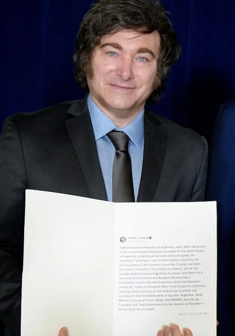 Trump soutient sans la moindre ambiguïté, à la fois politiquement et économiquement, le gouvernement de Milei. Mais ce soutien n’est pas gratuit. Il est à parier que nous découvrirons que la pays a été bradé à des entreprises et/ou l’armée étasuniennes.