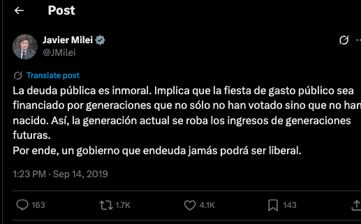 Ce message, la dette publique c’est mal, Javier Milei l’a dit de nombreuses fois, dans tous les formats possibles (télés, conférences, tweet, etc).