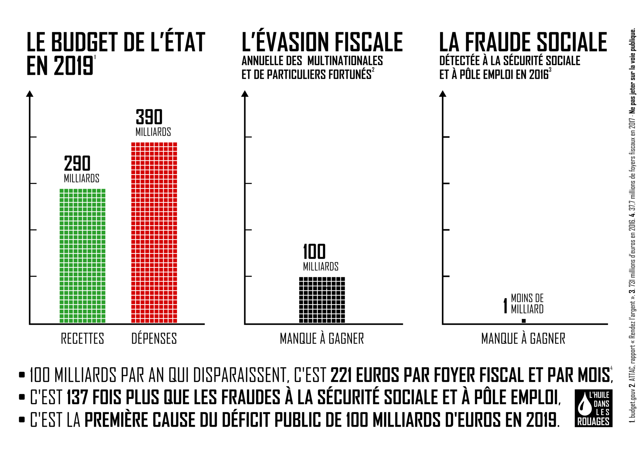 En 2019, les recettes du budget général (impôt sur le revenu, sur les sociétés, TVA, etc.) atteindront 290 milliards d’euros, les dépenses 390 milliards (1). Ce déséquilibre engendrera un déficit public annuel de l’ordre de 100 milliards d’euros (85 milliards en 2018). Mais une question demeure : la faute à qui ? L’évasion fiscale et l’optimisation agressive des multinationales, ainsi que la fraude fiscale de riches particuliers, priveraient l’État d’au moins 100 milliards d’euros de recettes par an, soit un montant équivalent au déficit public prévu en 2019 (2) ! 100 milliards qui s’évaporent chaque année, c’est 274 millions d’euros par jour ! En schématisant, on peut dire qu’une journée d’évasion fiscale, c’est un million d’euros en moins pour 274 hôpitaux. Une autre journée, c’est 27 400 écoles qui font une croix sur 10 000 euros. Ce fléau coûte plus cher que les budgets de l’éducation nationale ou de la santé (1). 100 milliards, c’est aussi 137 fois le montant annuel des fraudes détectées aux prestations sociales (1). Cela représente un préjudice de 221 euros par mois pour chacun des 37,7 millions de foyers fiscaux français. Ainsi, il est absolument grotesque de conclure que le problème réside du côté des dépenses de l’État. Le vrai problème, c’est les recettes.