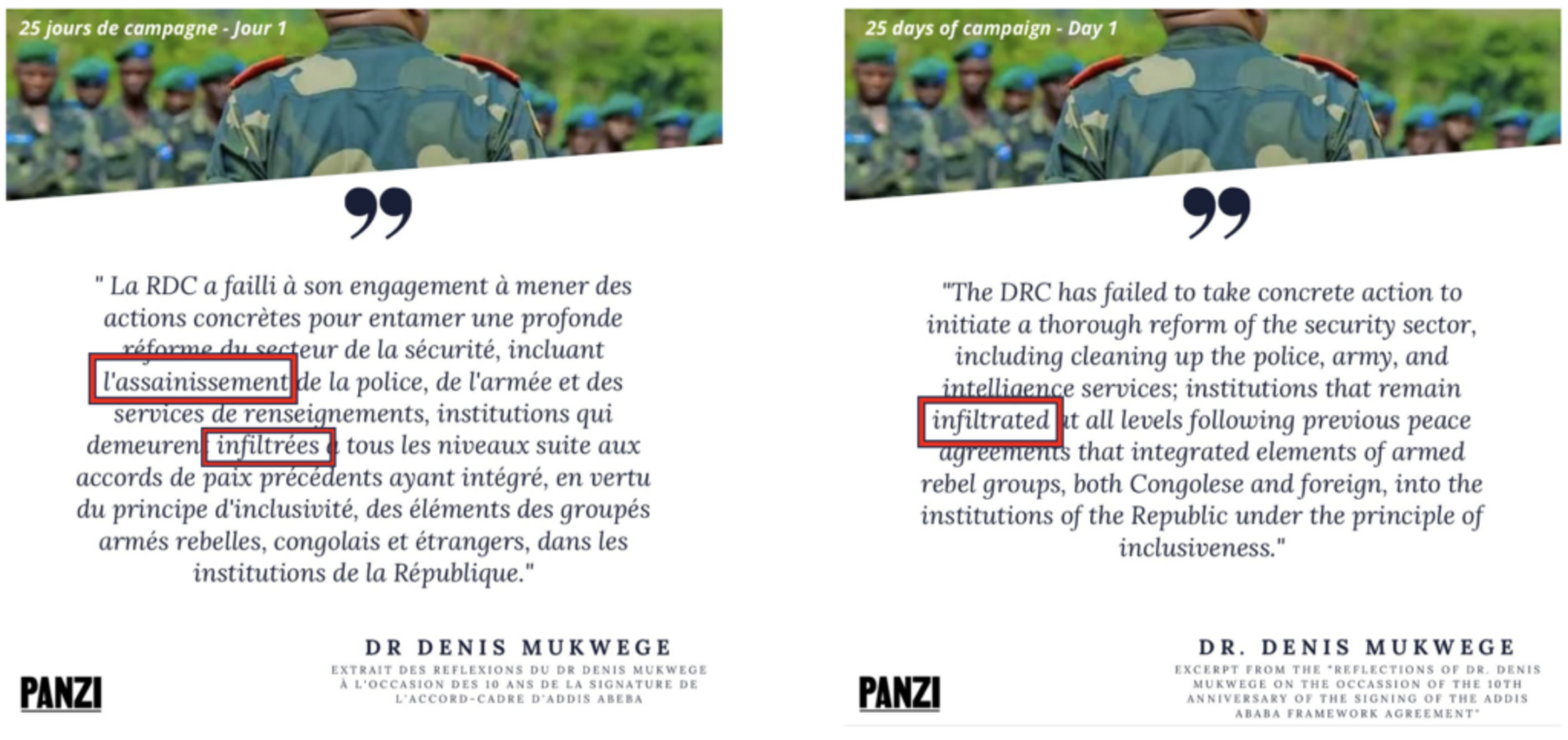 Plus invraisemblable enfin, à la page 173 de son ouvrage La force des femmes, Denis Mukwege tient à saluer les forces policières et armées officielles du Congo en ces termes : « Les policiers et les soldats qui servent au Congo font de leur mieux avec professionnalisme et courage » alors qu’il est avéré que les hommes en uniforme officiel de la RDC font partie des principaux agresseurs des femmes congolaises. Ainsi, dans sa volonté de se faire figure nationale aimée de tous au Congo, dans le registre d’une union nationale et raciale sacrée contre un agresseur, un autre extérieur, le prix Nobel félicite chaleureusement l’une des armées les plus indisciplinées, corrompues et violentes du continent africain.