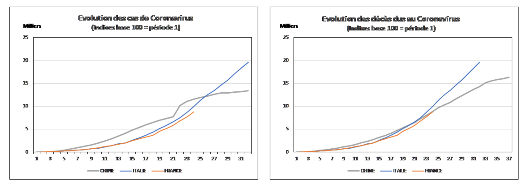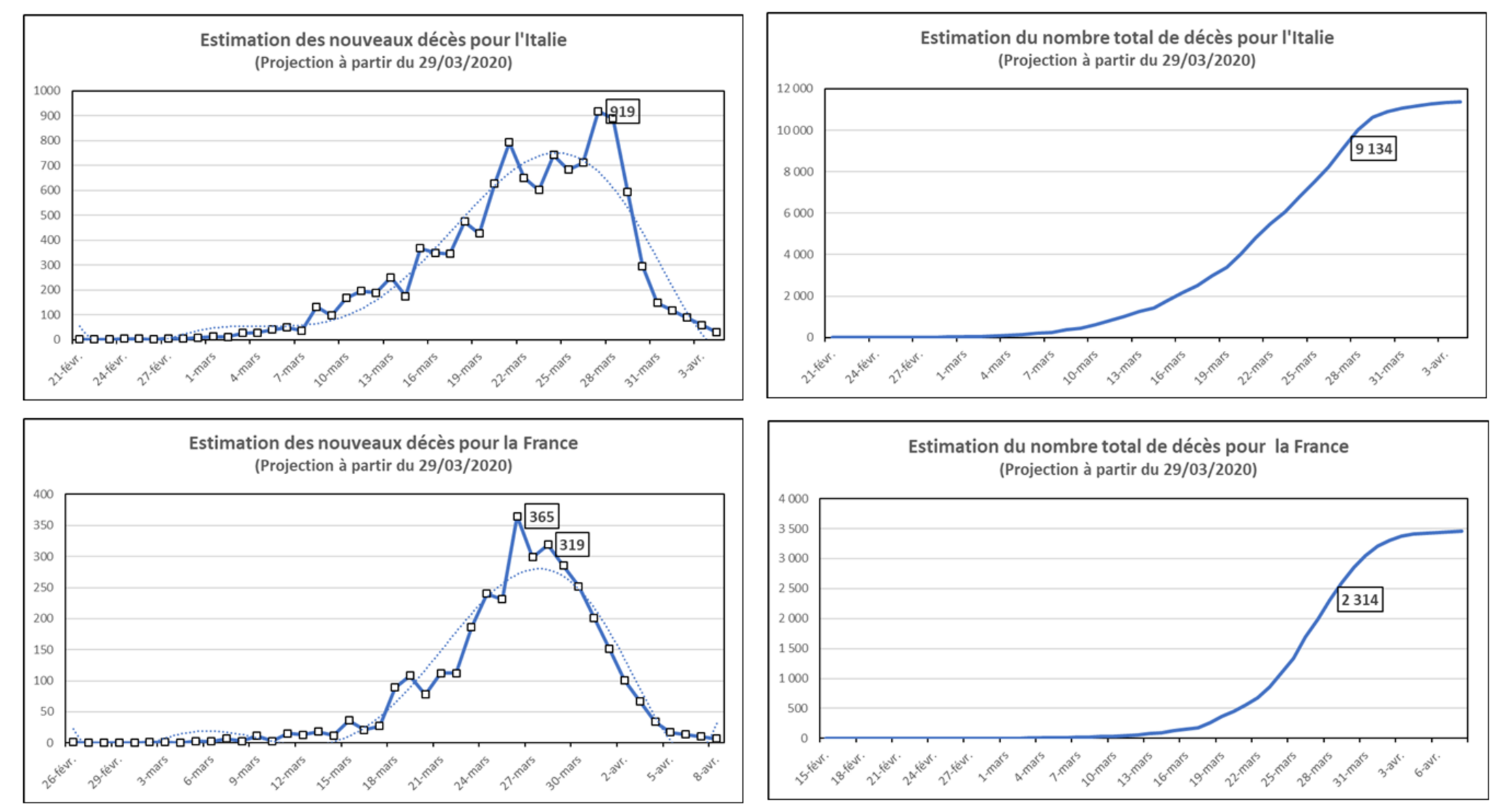 Comme on peut le constater dans le graphique de gauche, alors que le nombre de cas déclarés en Chine tend à ralentir au bout de 3 semaines (si l’on en croit les chiffres officiels), celui des Italiens continue à progresser jusqu’à la fin du premier mois et celui de la France est toujours en croissance au 24ème jour. Néanmoins, le plus remarquable c’est le parallélisme des courbes française et italienne qui ont un profil presque identique. C’est encore plus vrai pour les courbes de décès (graphique de droite), où les progressions chez les deux sœurs latines suivent la même évolution tandis que la mortalité totale ralentit en Chine et atteint progressivement un plateau.