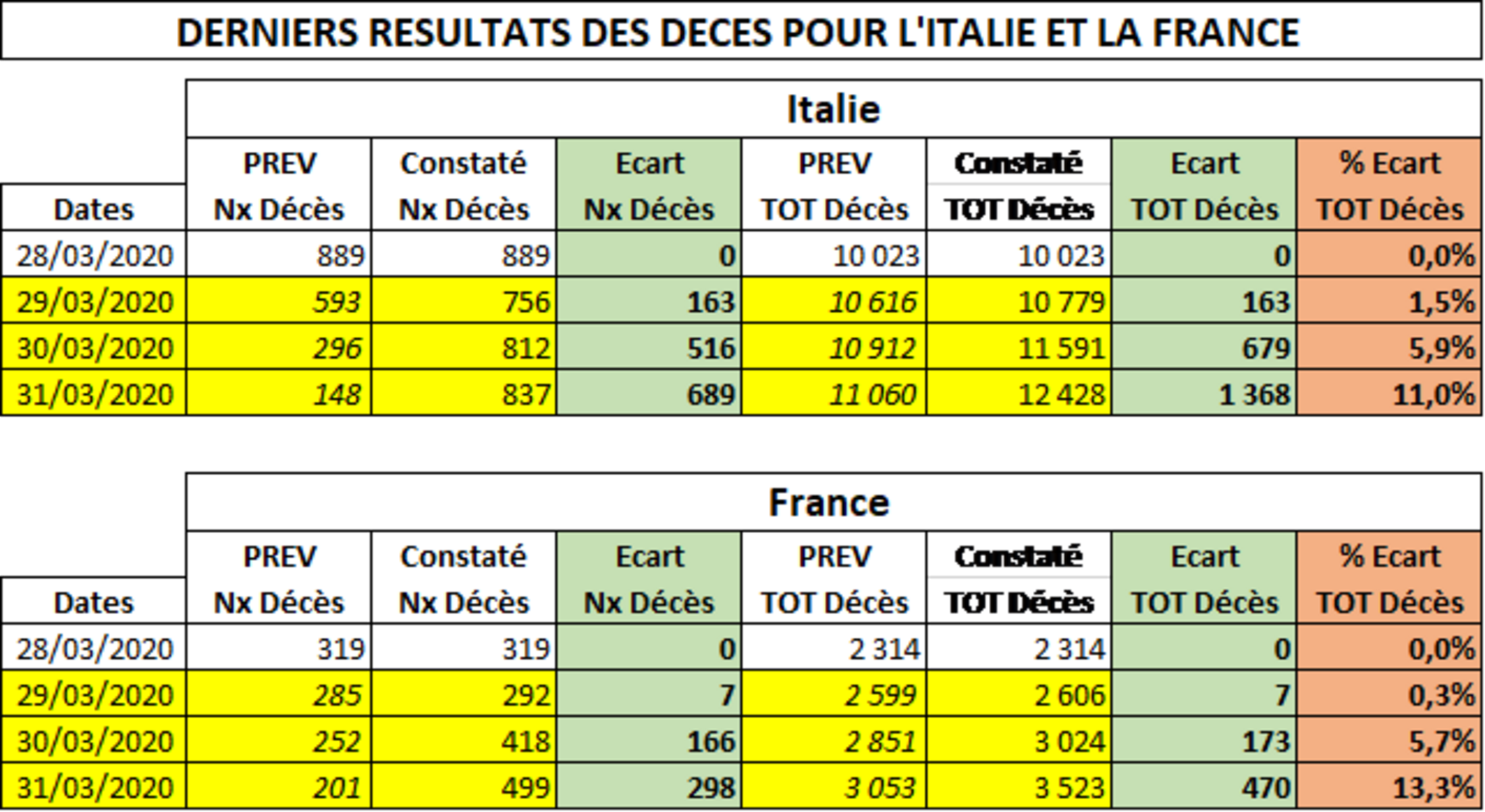 Ma première remarque finale tient à la difficulté de suivre l’évolution en temps réel compte tenu de la durée nécessaire pour intégrer les données les plus récentes. Toutefois, j’ai pu faire figurer les derniers résultats de décès qui ont été enregistrés depuis dimanche 29 mars jusqu’à ce soir, et les résultats sont éloquents. Les séries présentent des « anomalies » croissantes sur les trois derniers jours, comme on peut le voir sur le petit tableau suivant qui vient d’être réalisé à l’instant :