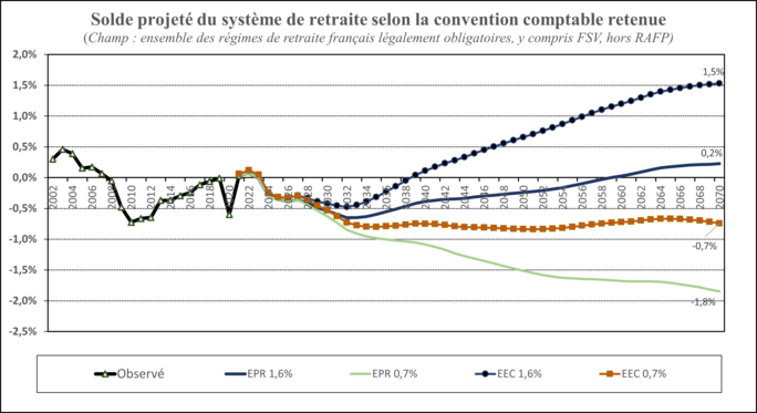 Cela est évident dans la Figure 10, où pour un même taux de croissance de la productivité le poids du financement public (en % du PIB) varie de 1,1 à 1,3 points d’écart, ce qui est considérable. Quel que soit ce taux, la convention EEC donne des courbes relativement plates (les deux courbes du haut avec des marques) qui reflètent un effort constant de l’Etat, mais à un niveau élevé (entre 13,6 % et 14 % du PIB en 2070). C’est évidemment un choix politique, celui de maintenir des ressources à un niveau proche de la dépense (14,7 % du PIB à +0,7 % de productivité en 2070), et donc d’obtenir un solde relativement faible (0,7 % du PIB en moyenne annuelle dans ce cas). C’est d’ailleurs ce solde moyen à l’horizon 2070 qui me semble le plus vraisemblable, compte tenu des hypothèses générales du COR qui sont apparemment surestimées, et rien n’indique véritablement que dans 50 ans les conditions seront les mêmes... Une autre façon de lire ces prévisions et ces projections est d’ailleurs de constater que beaucoup va dépendre de la politique du gouvernement dans le mode de financement d’un éventuel déséquilibre ! On peut y ajouter que celui-ci serait plus fort avec la convention EPR.