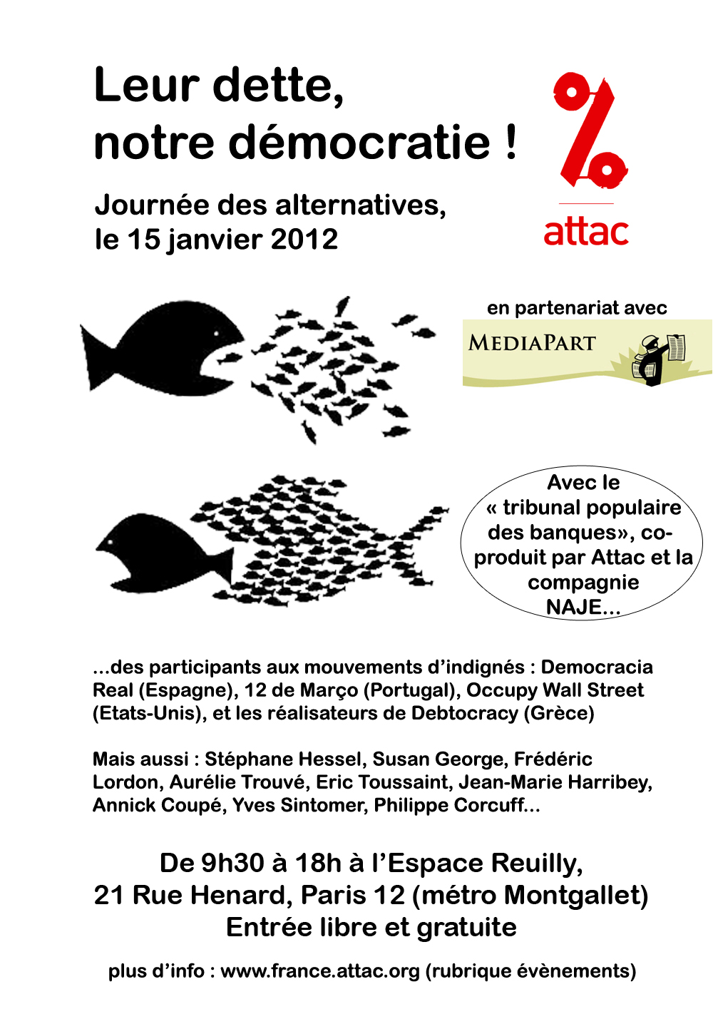 C'est dans ce contexte qu'Attac organise en partenariat avec Médiapart une journée des alternatives le 15 janvier « Leur dette, notre démocratie », de 9h30 à 18h, à l'Espace Reuilly (21 rue Hénard, Paris 12ème, métro Montgallet).